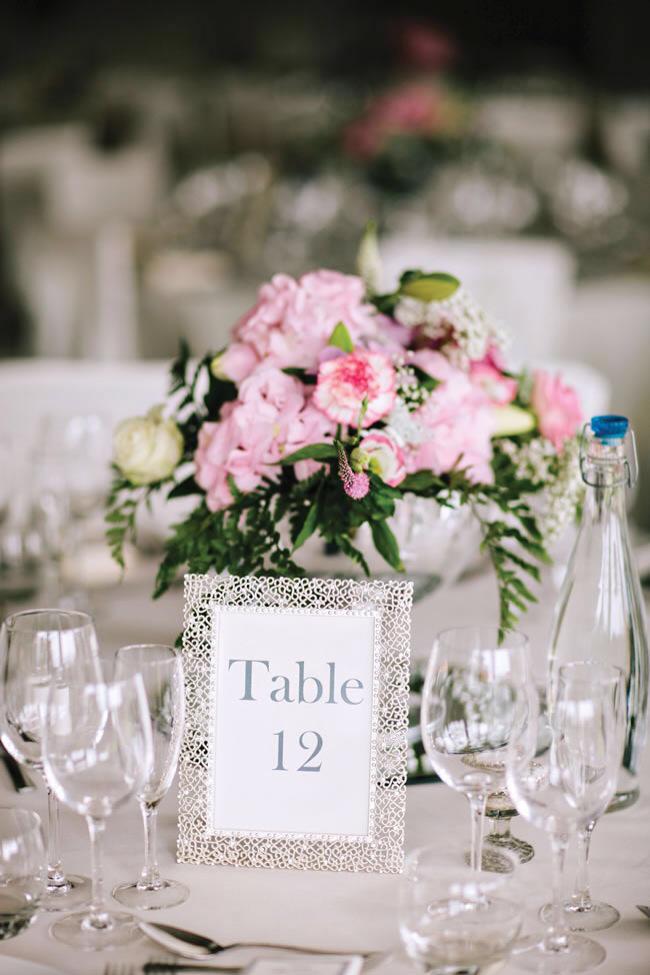 Habla con tu restaurante para que puedan incluir un centro de mesa con alguna flor rosa. Mi consejo, para que quede armonioso y no todo lo contrario, es que las flores sean blancas y en el centro de ellas, una rosa. Elegante, minimalista y sofisticado.