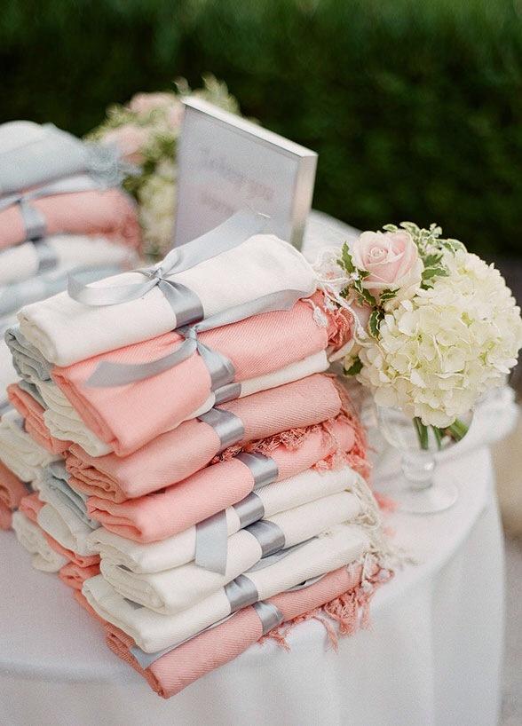 Como regalo, unas lindas pasminas en tonos rosas y beige será una buena opción. Colócalas en cajas de madera antigua, e incluso en una mesa con un marco que diga por ejemplo: “coge tu regalo” “tu obsequio” “coge uno, gracias por venir”. Tiene que quedar claro que es para que lo cojan.