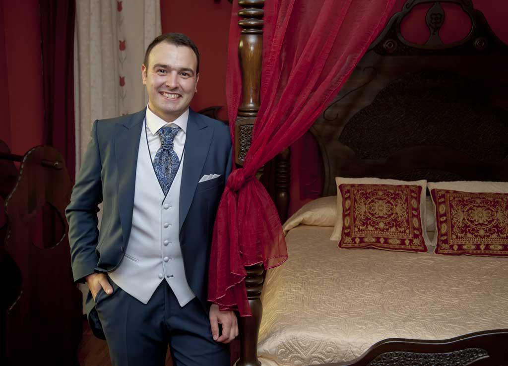 “El traje de novio también se compró en Pamplona, en Enzo Bari. Una tienda que supo captar la idea que Jesús tenía en mente. No quería ser un novio llamativo ni un novio clásico. Quería encontrar una percha a su medida y así fue. Un semichaqué y unos detalles en color azul, conjuntados con un corbatín y unos tirantes hicieron que luciera guapísimo. “Sobre las fotos de la boda