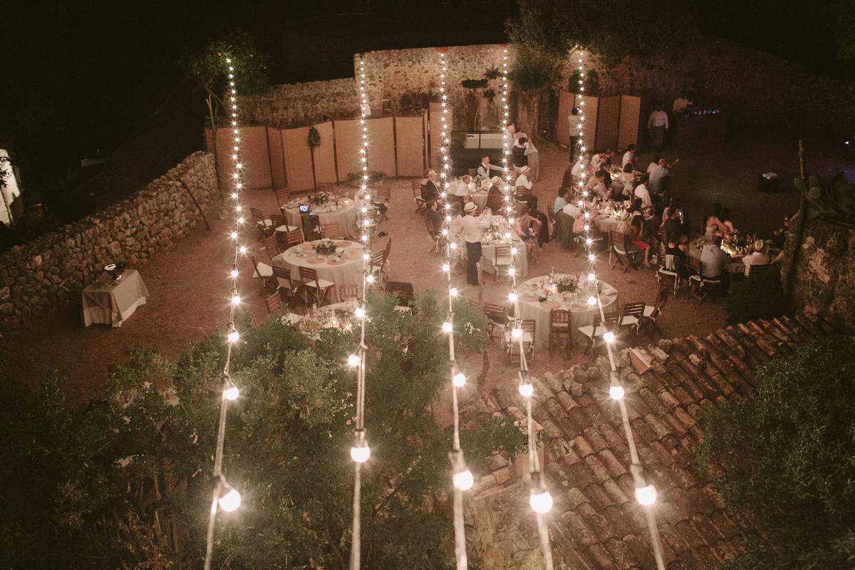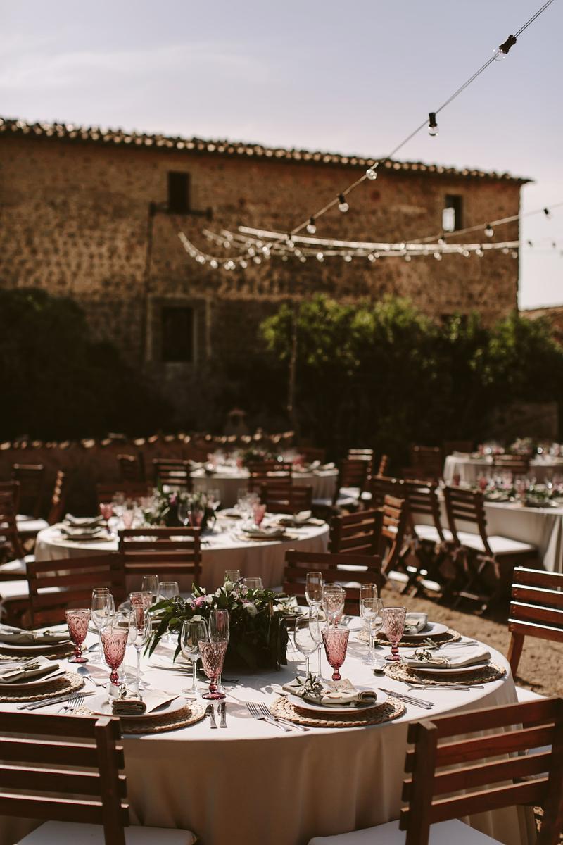 Dispusimos las mesas en el patio de la casa y se decoraron en el mismo estilo natural y rústico. Completaron el ambiente unas guirnaldas de luces que quedaron muy bonitas cuando cayó la noche ¡y comenzó la fiesta!