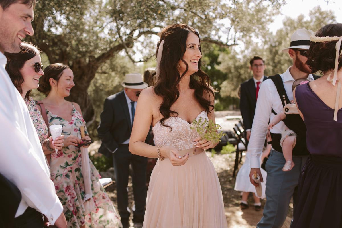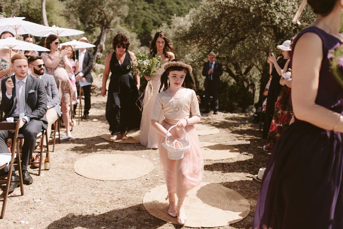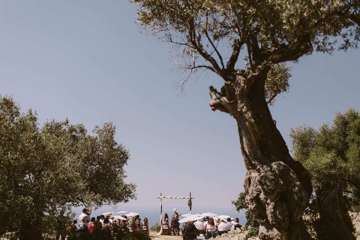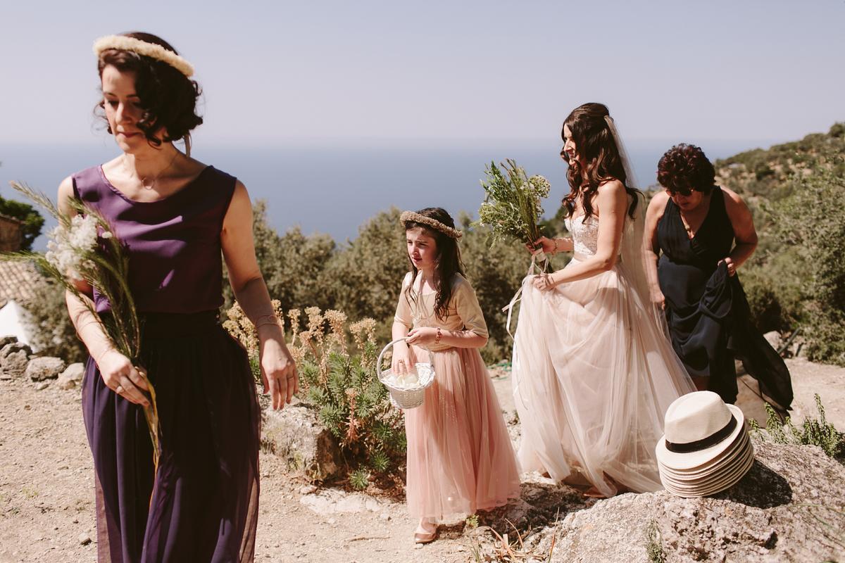 Para casarse eligieron una zona elevada respecto a la casa lo que añadió a la ceremonia un paseito por el camino que quedó muy romántico ya que desde arriba el novio y los invitados vieron llegar a la novia acompañada de un séquito de damas de honor…Como testigo de honor, el precioso mar mediterráneo de fondo.