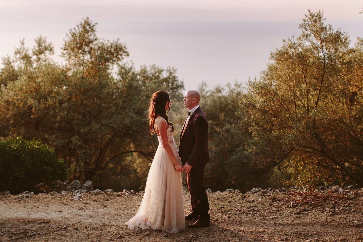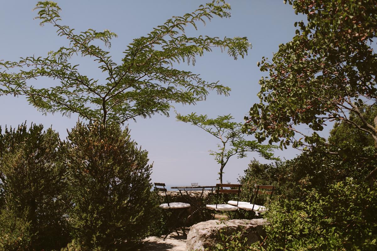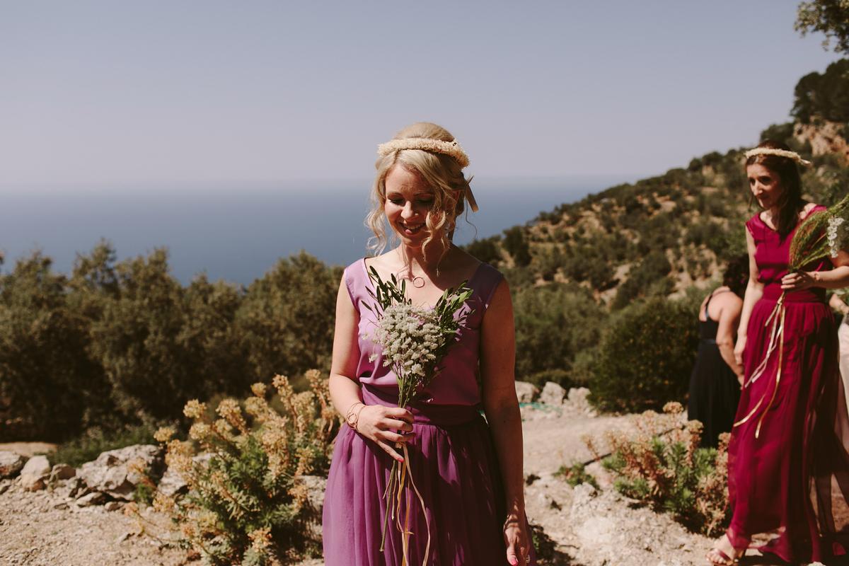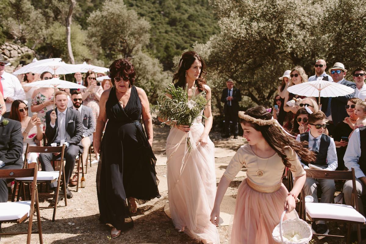 Para casarse eligieron una zona elevada respecto a la casa lo que añadió a la ceremonia un paseito por el camino que quedó muy romántico ya que desde arriba el novio y los invitados vieron llegar a la novia acompañada de un séquito de damas de honor…Como testigo de honor, el precioso mar mediterráneo de fondo.
