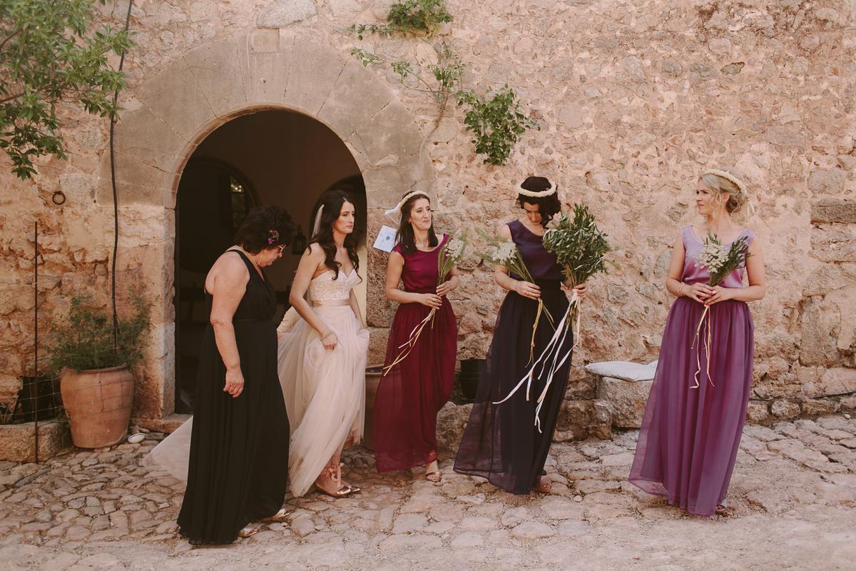 Las damas de honor también eligieron tejidos muy suaves a juego en otros tonos acompañados por unas pequeñas coronitas de flores que remataban su tocado, ¡todo muy etéreo y suave! Su madre le hizo entrega del ramo y las demás inmortalizaron el momento con sus móviles.