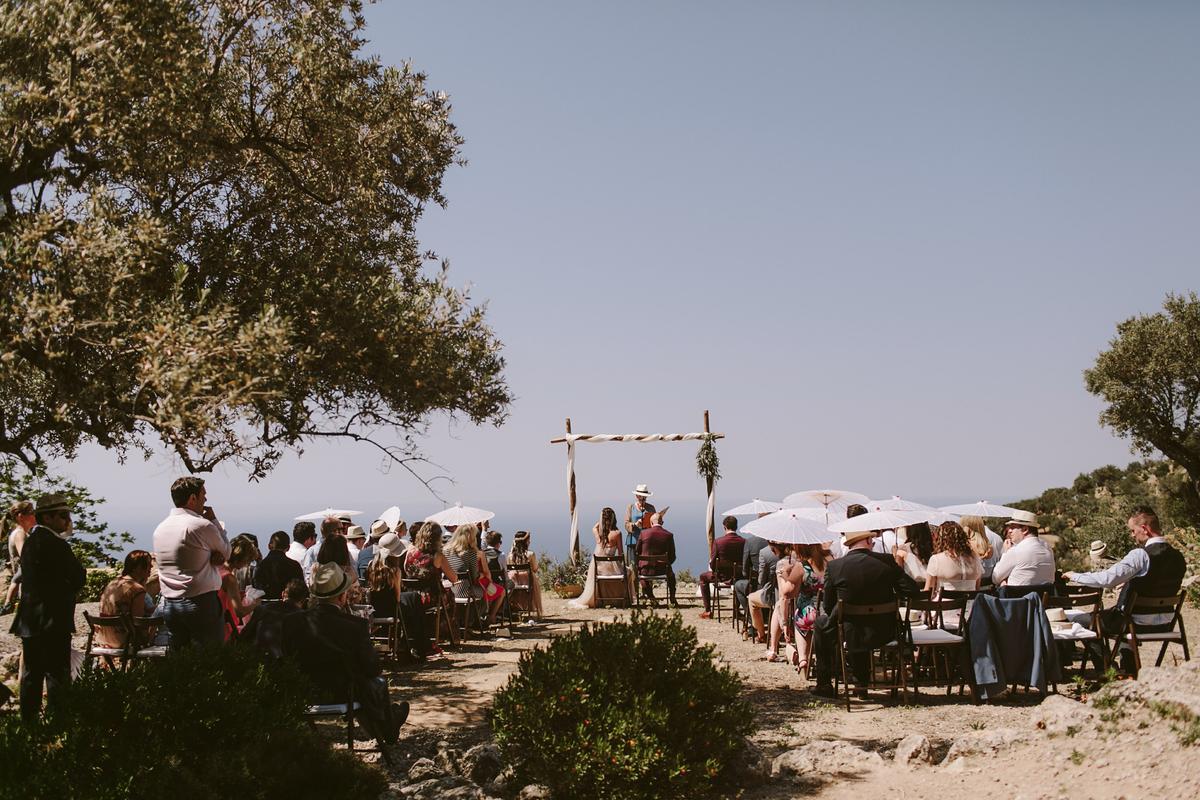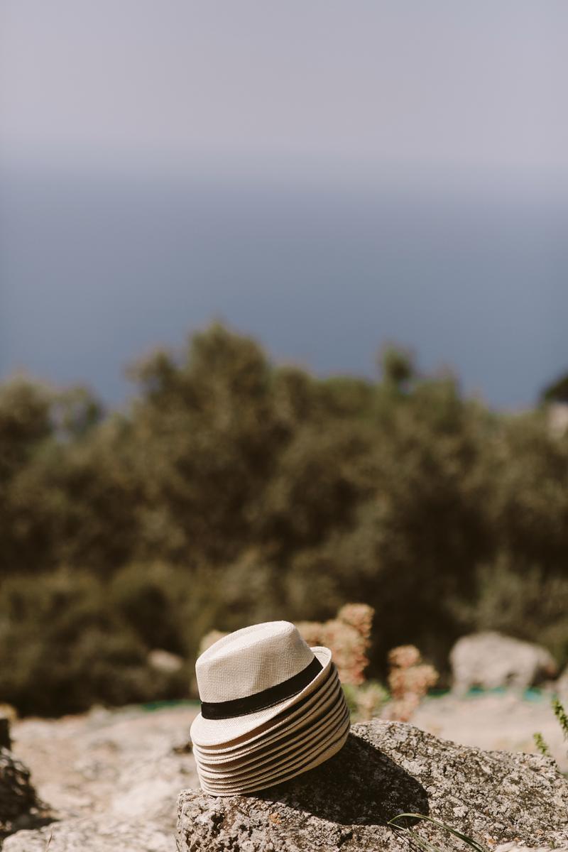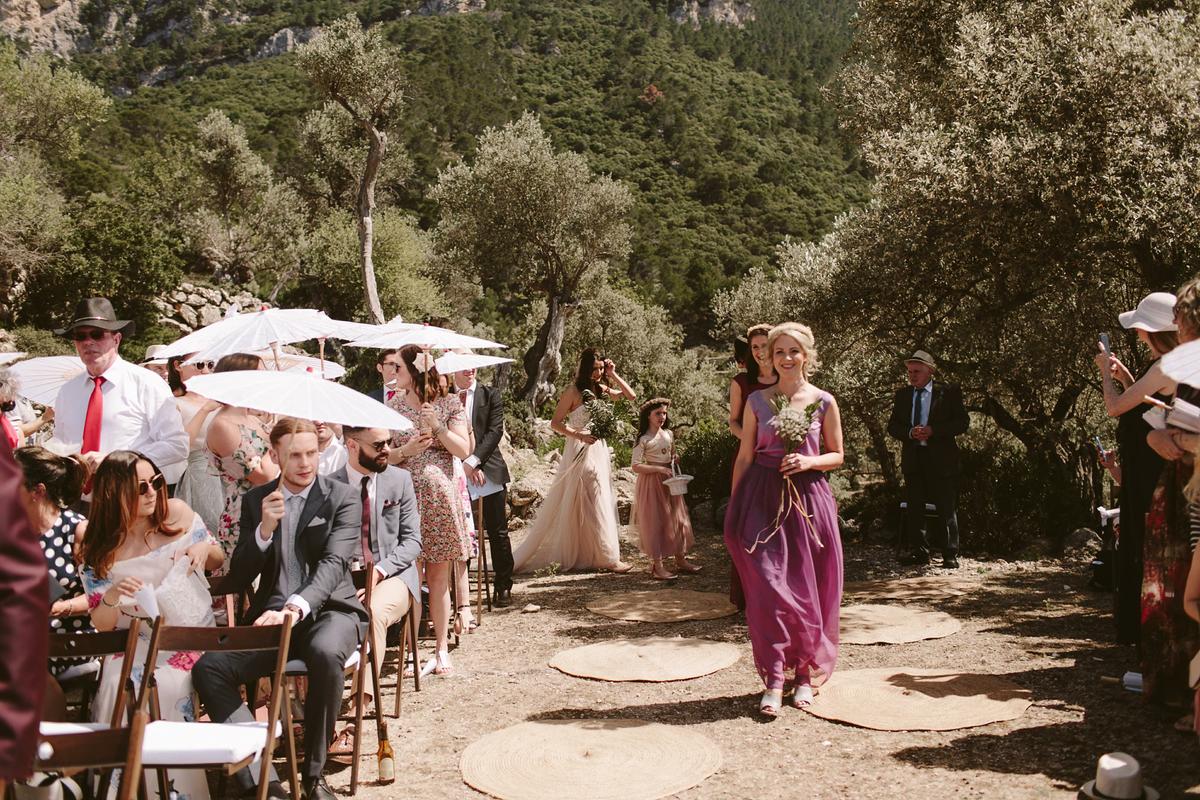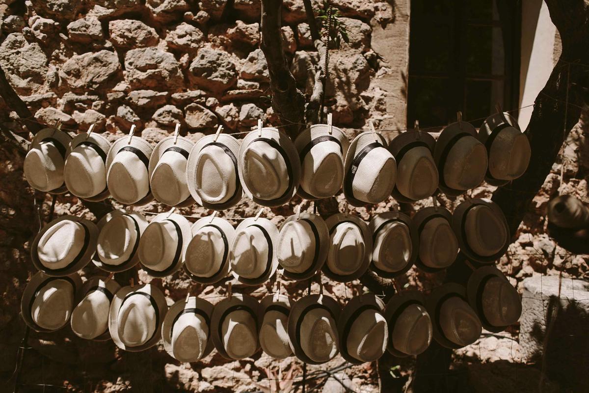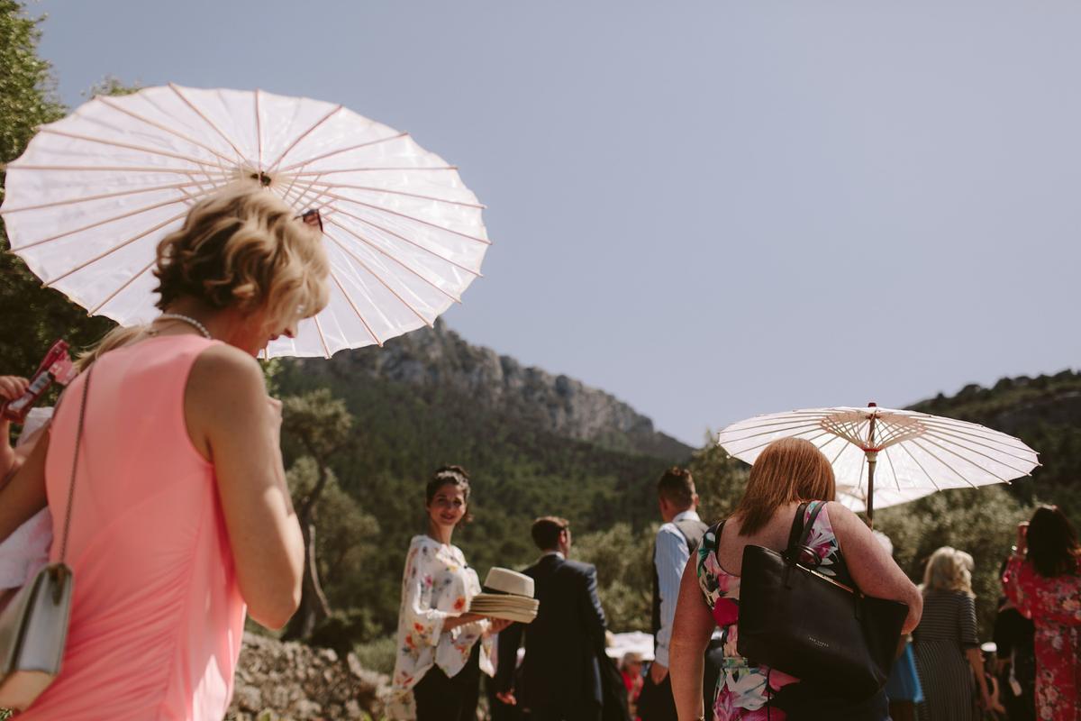 Toda la boda transcurrió en la misma finca. Los invitados fueron recibidos con un welcome drink donde además se les ofreció sombreros y sombrillas para protegerse del sol que, aunque en las montañas, en Mallorca y en verano, aprieta.