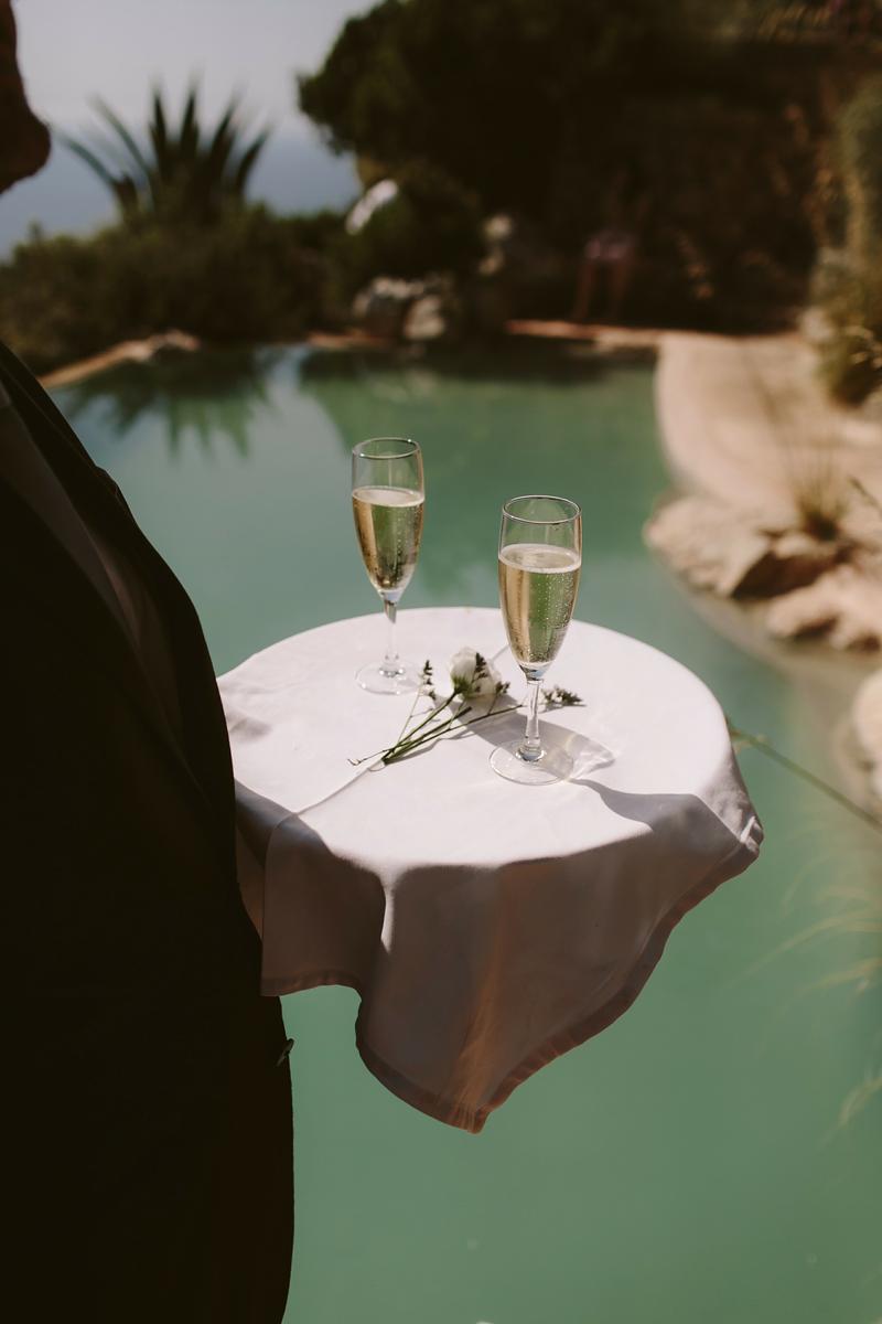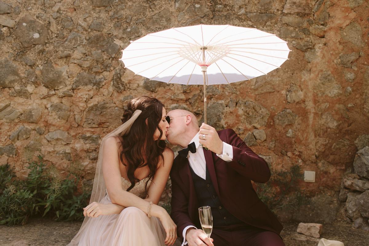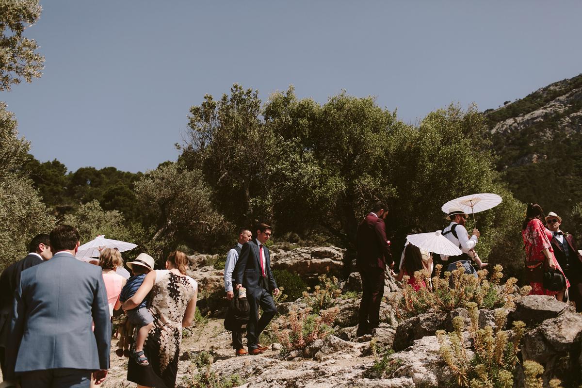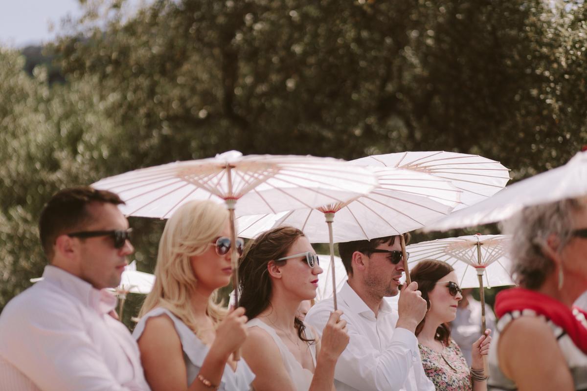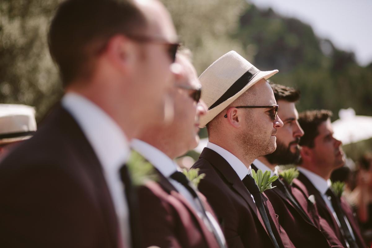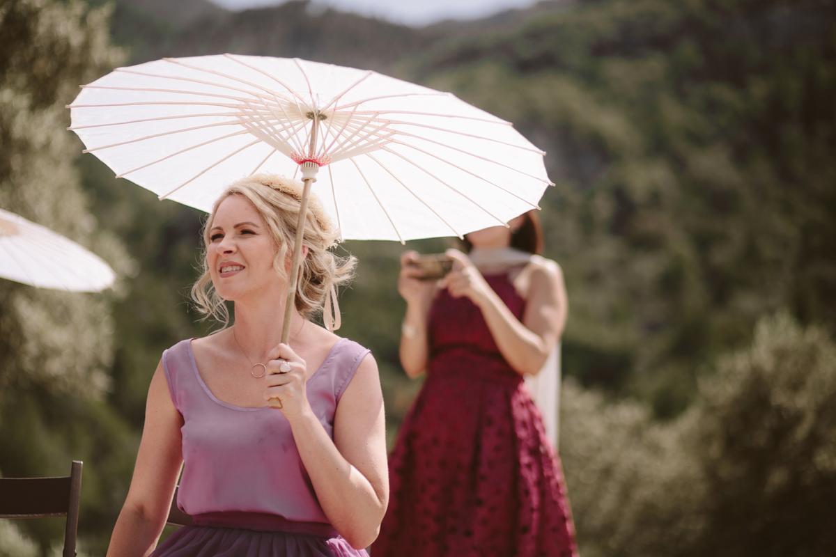 Toda la boda transcurrió en la misma finca. Los invitados fueron recibidos con un welcome drink donde además se les ofreció sombreros y sombrillas para protegerse del sol que, aunque en las montañas, en Mallorca y en verano, aprieta.