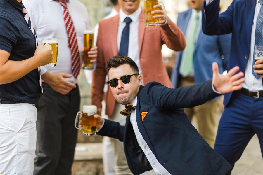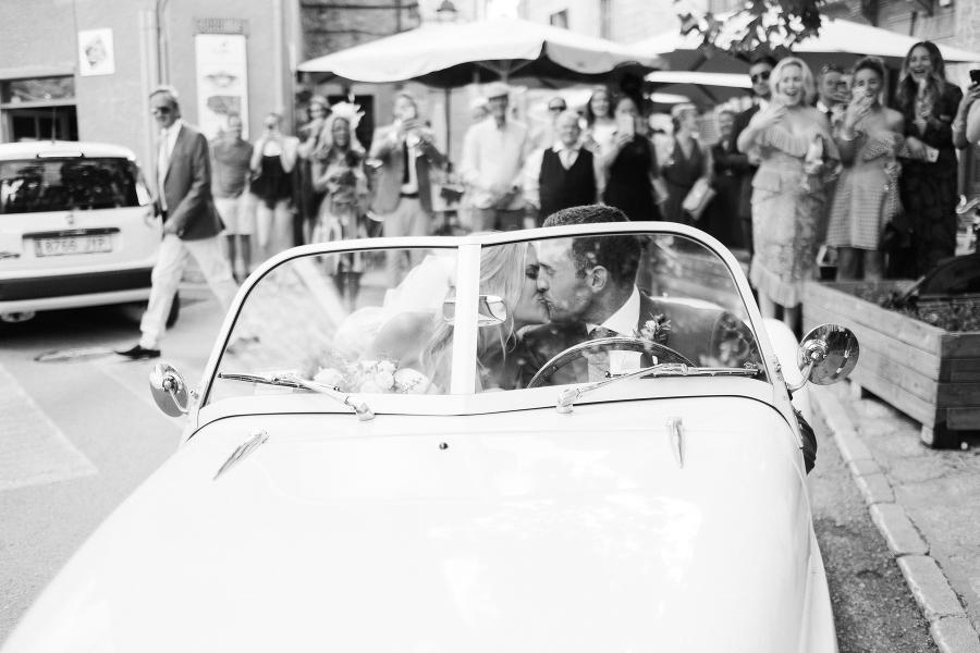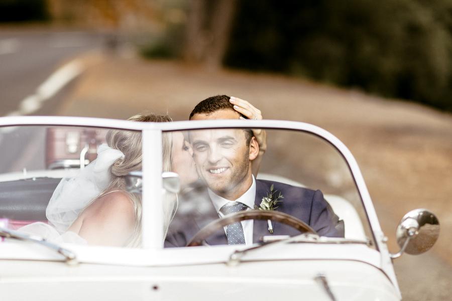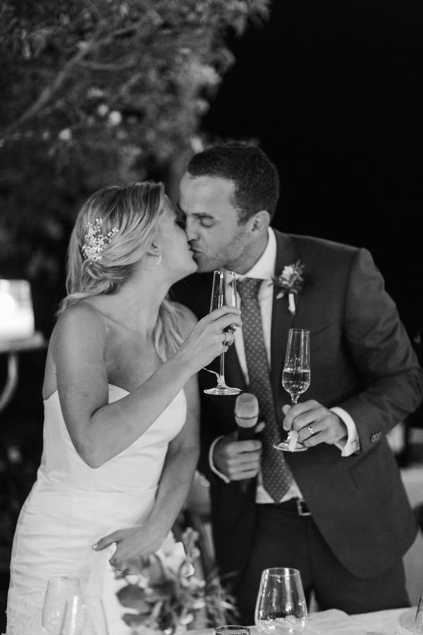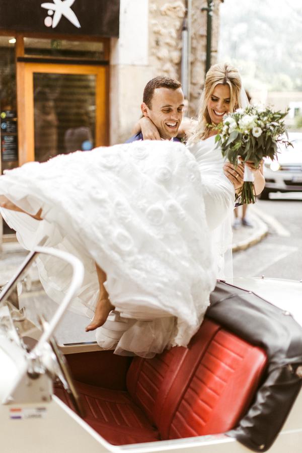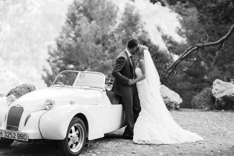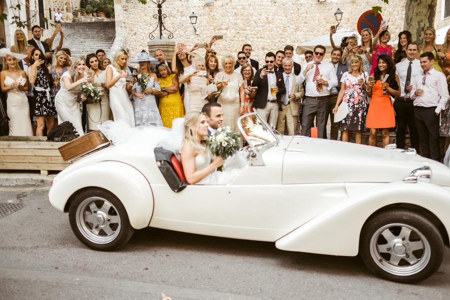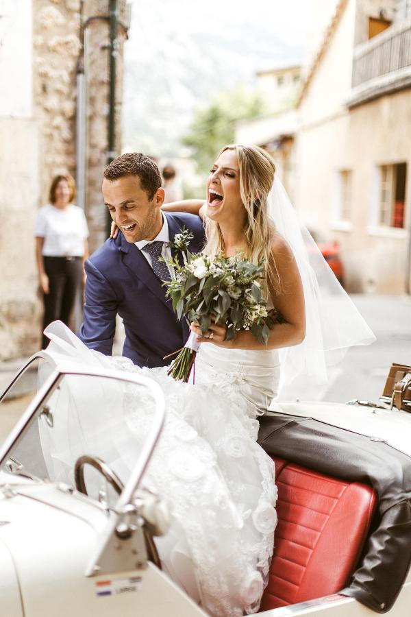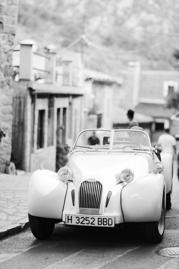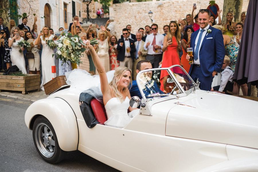 “Tenemos que agradecer especialmente a Henni y Jamie del café Sa Plaça porque nos ayudaron a planear la noche antes de nuestra boda y fue una noche muy divertida. También celebramos una recepción de champagne, a la salida de la iglesia, que era justo lo que necesitábamos para calmar las temperaturas de Agosto. Después Adam y yo nos fuimos hacia la Finca Monnaber con un precioso coche deportivo antiguo subir. El coche fue una gran elección!!”
