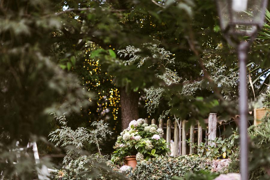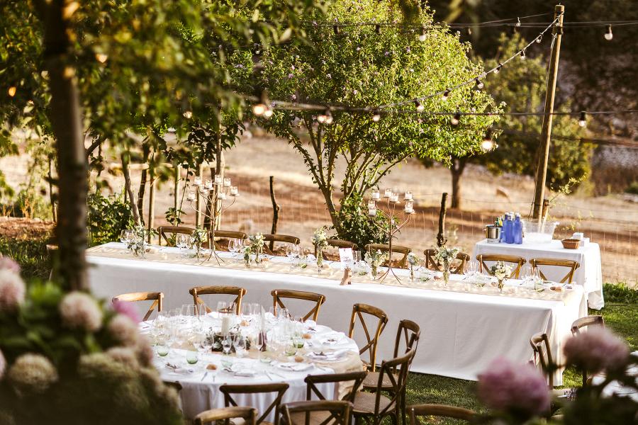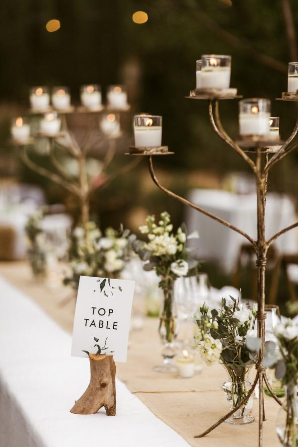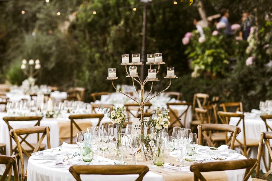 Para el banquete dispusimos mesas en el jardín, todo decorado en todos naturales con elementos autóctonos como el olivo y bonitos centros florales, además de los candelabros altos que aportaron, además de luz, mucha elegancia al conjunto. La verdad es que con un entorno tan espectacular como el que ofrece la misma finca, el resultado no podría ser más bonito. También colgamos unas guirnaldas de luces por todas partes entre los árboles que obrarían su magia al caer la noche…