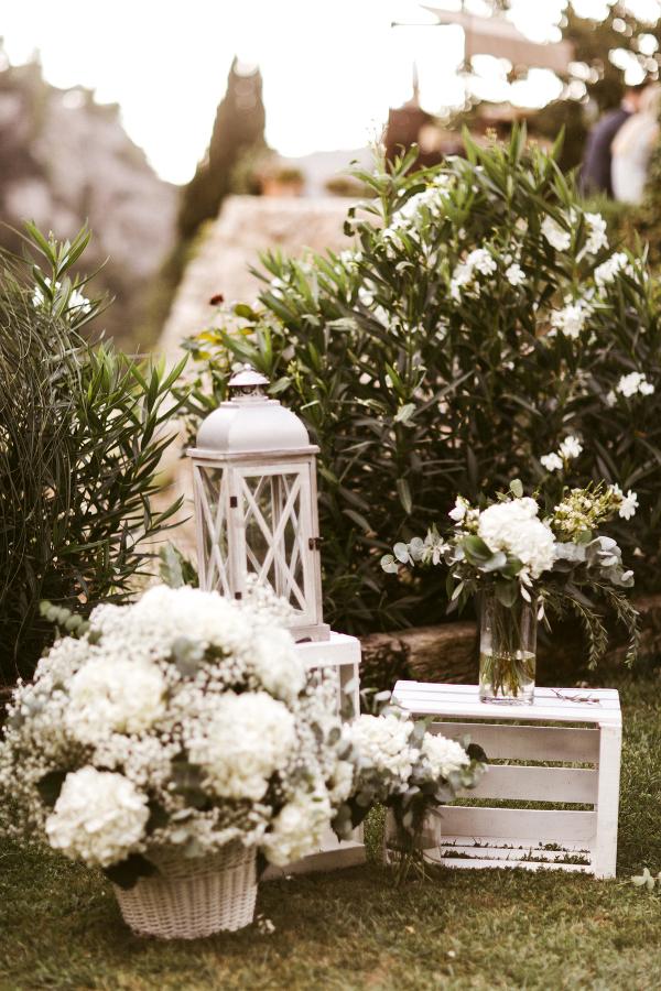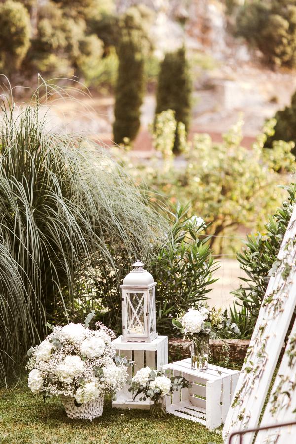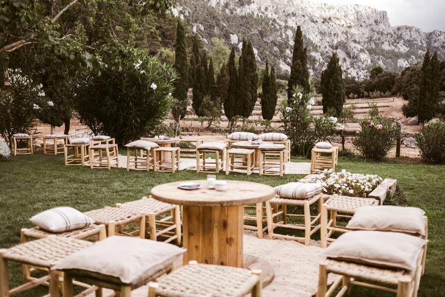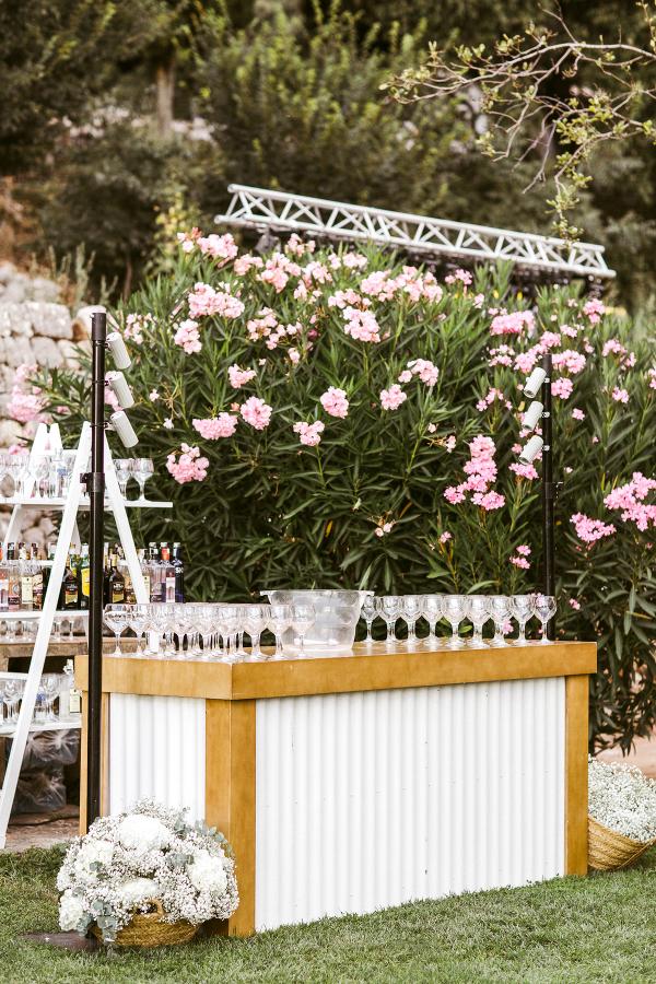 Dispusimos una zona tipo chill out con mobiliario de estilo mallorquín con cojines, mesas de madera, cajones, candelabros y ¡muchas florecillas! Así quedó todo con un toque muy romántico además de muy funcional ya que los invitados pudieron disfrutar de varios ambientes en un mismo lugar…
