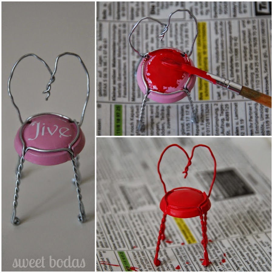Ahora es el turno del respaldo. Con el alambre sobrante del paso anterior, se le da forma a lo que será el respaldo de la silla. En este caso he hecho un corazón pero podéis hacer el diseño completamente a vuestro gusto. Para colocarlo, se sujetan ambos extremos del respaldo a las patas traseras de la silla. Una vez hayamos acabado, la pintamos.