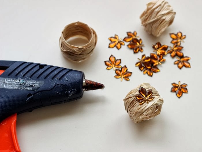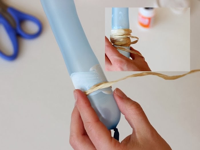 Una vez que lo tenemos inflado, ponemos un poco de cola sobre el globo y vamos enrollado la rafia de forma irregular, cuando tenga la medida que vosotras veáis conveniente, cortáis la rafia y la pegáis.