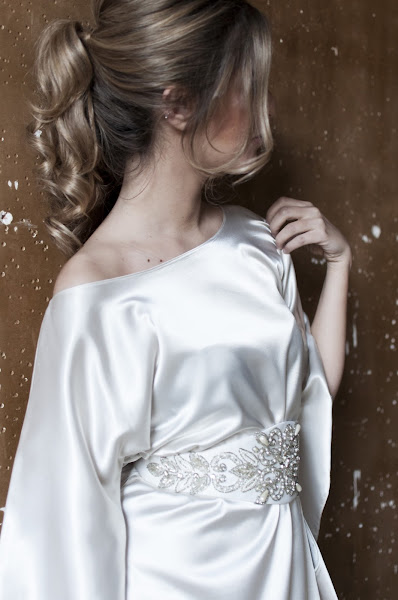 El segundo de los diseños no era menos espectacular; se trata de un kimono en raso de seda con cinturón de pedrería que se combinó con una coleta alta semi despeinada que le daba a la novia un toque desenfadado a la par que sensual.