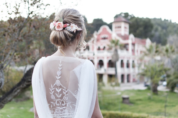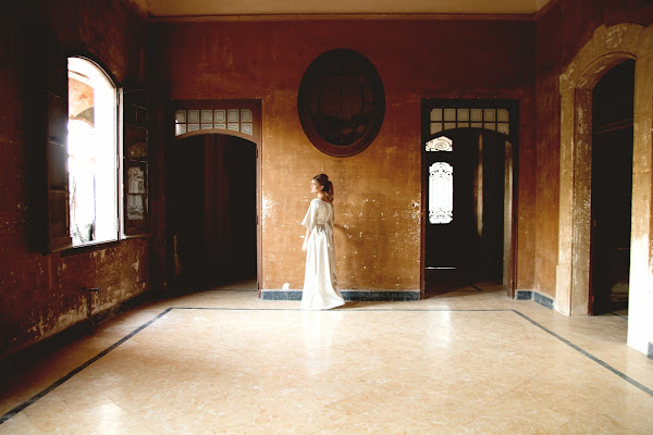 Este editorial llegó a nuestras manos gracias a Laia y nos pareció una auténtica preciosidad. Se realizó a finales de marzo en el castillo de Ben Viure (Barcelona). Es una construcción familiar de estilo indiano que data de 1935. Antiguamente esta finca se dedicaba a los viñedos, todavía se conservan las prensas y el etiquetaje de las botellas, pero en la actualidad se utiliza para todo tipo de eventos, rodajes de películas, publicidad, editoriales... Aunque está en proceso de remodelación, el castillo encajaba perfectamente con lo que se quería mostrar: la dulce espera de una novia justo antes de dar el sí quiero, en soledad, con dulzura, que es justamente lo que se siente cuando te encuentras dentro del castillo.