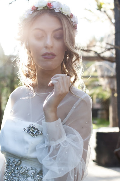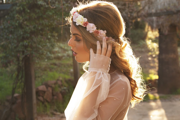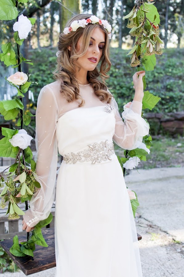 Ester, la guapísima modelo protagonista del shooting, lució tres increíbles diseños de Carme Trias una diseñadora barcelonesa que confecciona vestidos de novia alternativos, diferentes, totalmente personalizados y a medida. El primero de ellos de manga larga confeccionado en tul plumetti y raso con cinturón de pedrería y perlas. El look de novia se completó con una corona floral y melena ondulada semirecogida y un maquillaje bastante pronunciado.