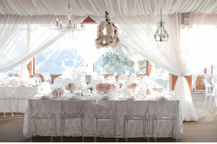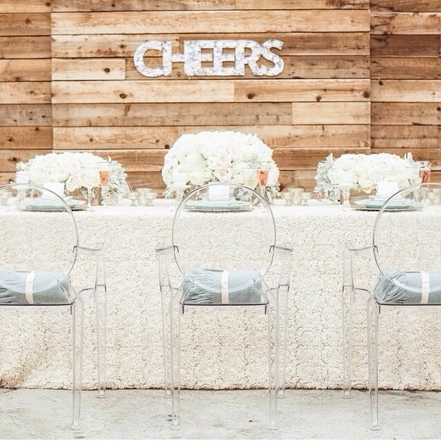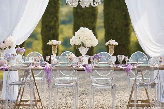 La Ghost chair es una silla de policarbonato acrílico cristalino, que aunque suene a chino de ahí viene su color transparente, el modelo más conocido pero que podéis encontrar también en otros colores. Diseñada por Philippe Starck, es una butaca Luis XVI reinterpretada, una silla de líneas clásicas con un elegante estilo histórico, minimalista y vanguardista. Confeccionadas con materiales muy ligeros, éstas sillas resisten cualquier condición climática por lo que son perfectas tanto en interior como exterior y para la ceremonia o el banquete.