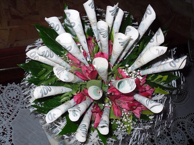 Este es uno de los más clásicos y que más se ha usado. Nada complicado y fácil de hacer. Se pueden hacer varios ramos con diferentes flores. A mi me gusta mucho billetes de rosas.