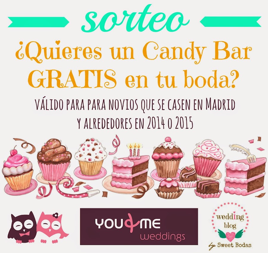 *El Candy Bar será exclusivamente para novios que se casen en Madrid y alrededoresen 2014 o 2015. El ganador/a tendrá que consultar disponibilidad y fechas con You and Me Weddings. Os sugerimos preguntar con antelación al catering que hayáis contratado, la posibilidad de colocar un Candy Bar, hay empresas que no permiten la entrada de productos alimenticios del exterior.