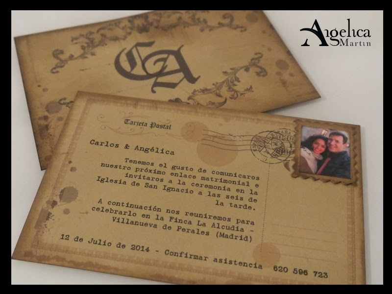Una invitación de boda con un toque de romanticismo, recordando las postales de amor que se escribían antaño.
