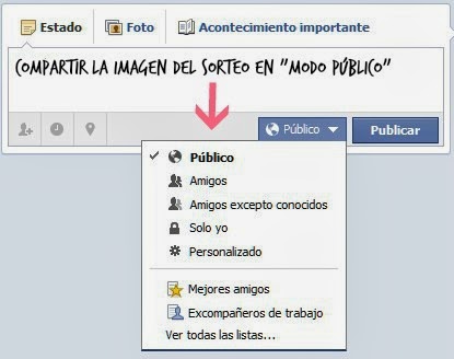 3. Comparte en "Modo Público" la imagen del sorteo en tu muro de Facebook. Este paso es muy importante, de lo contrario no podremos verificar que habéis cumplido las normas del concurso y no podréis participar.