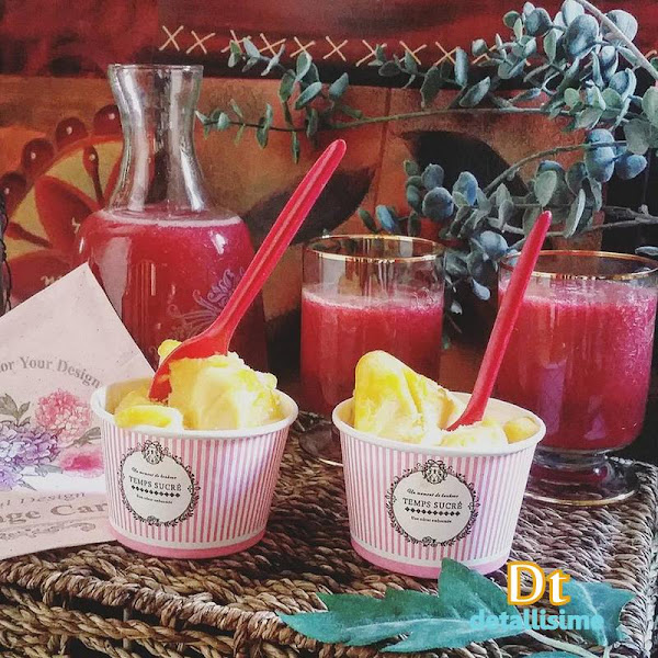 Opta por helados, que gustan a todo el mundo y apetecen siempre. Este de la foto es de mango, que hemos elegido por su tono naranja y que contrasta con las tarrinas de rayitas rosas, con las cucharas rojas. Y, por supuesto, con el zumo que se ve en el fondo, que con su color granate, es el atrezzo perfecto!!!