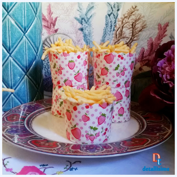 No te compliques la vida. Pon unos aperitivos salados, los de la foto son patatas fritas, en nuestras tarrinas de topos rosas con fresas (5.5 cms) y quedarás divinamente...