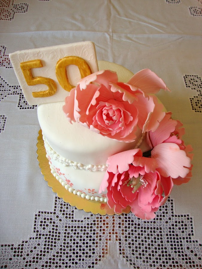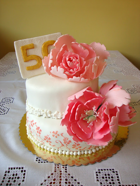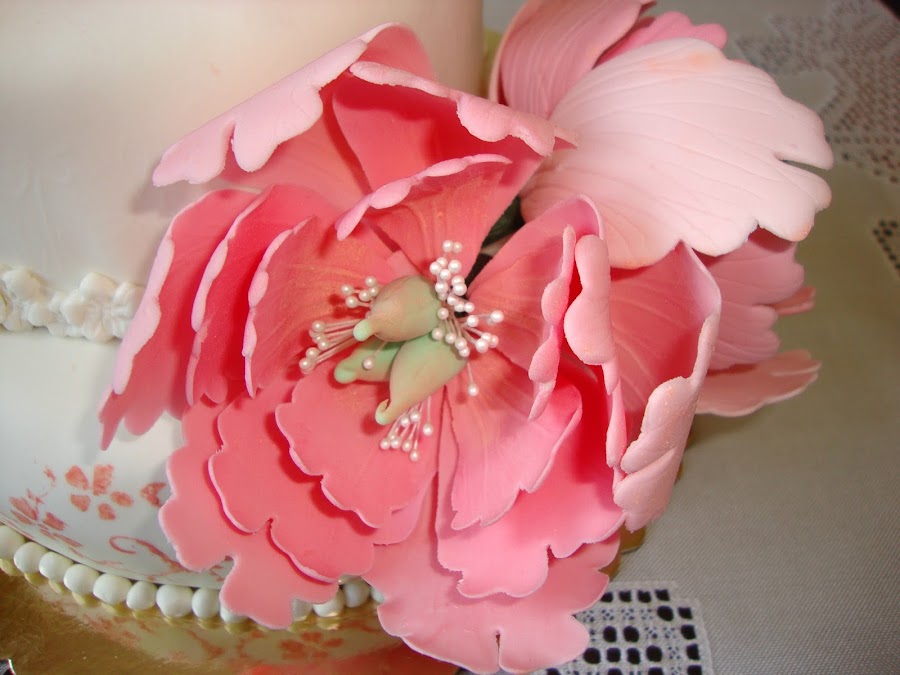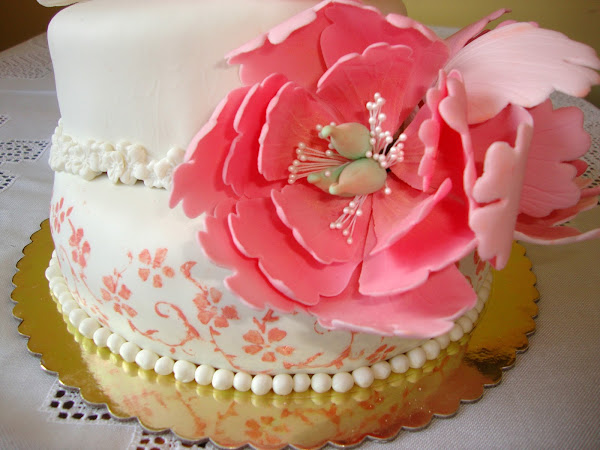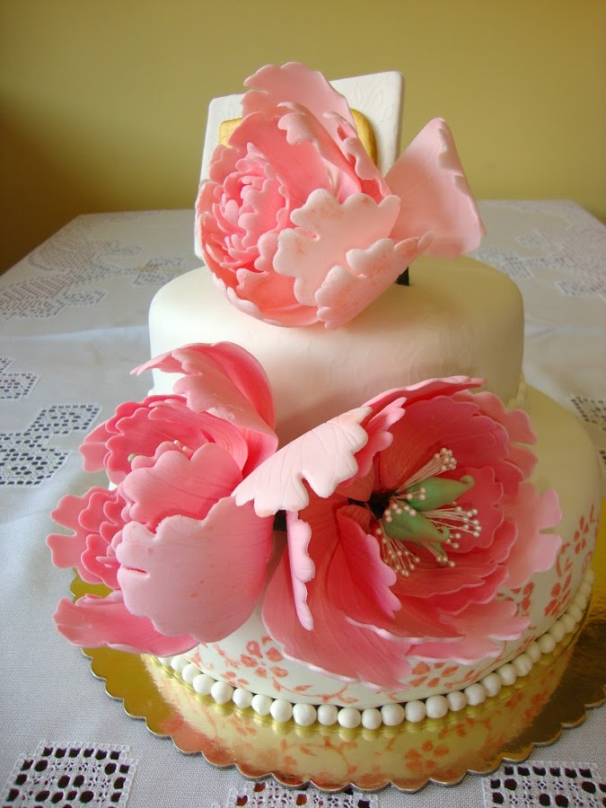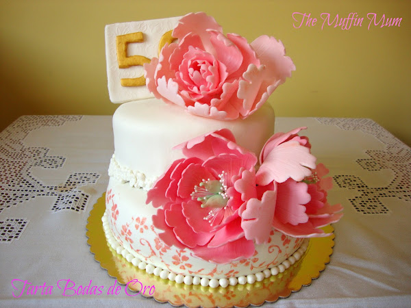 La decoración está realizada con fondant, pasta de flores y pintura comestible; tiene otros elementos no comestibles como estambres, alambres y cinta de flores.
