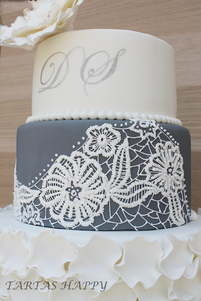 Todo el encaje bordado está hecho a mano con glasa,pero merece la pena todo el tiempo que se emplea ya que hace un efecto muy bonito y delicado en la tarta.