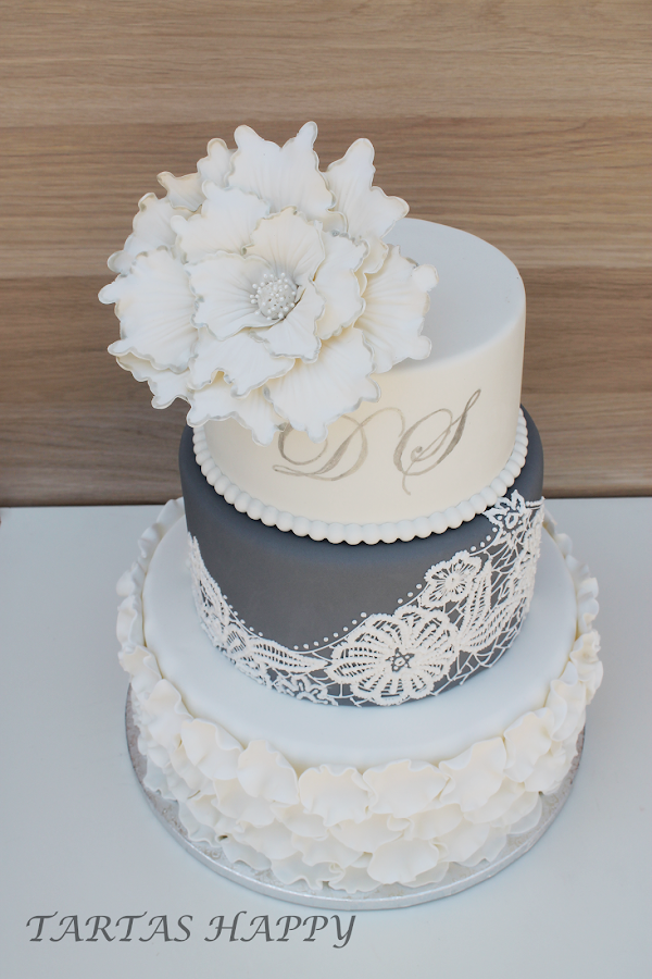 Y no he visto mejor ocasión que esta para poner en practica todo lo que aprendí en el curso de tartas bordadas y como su vestido era de volantes y encaje pusimos la tarta a juego.