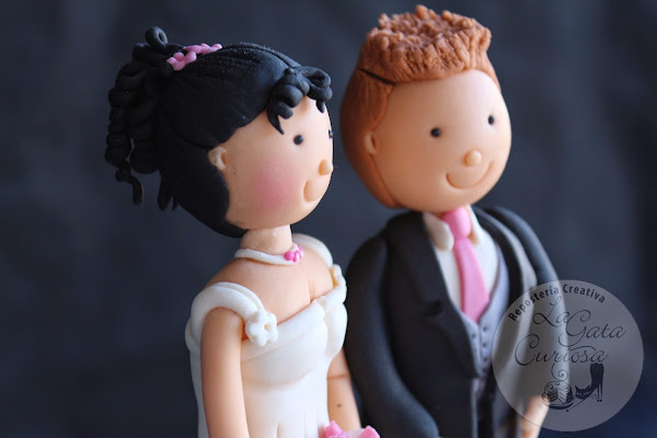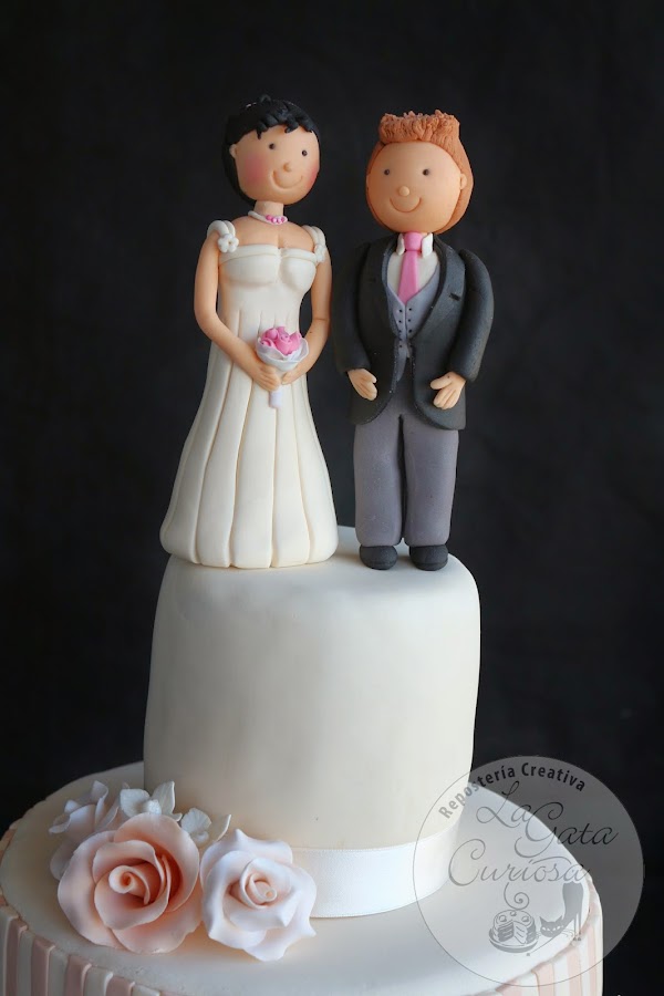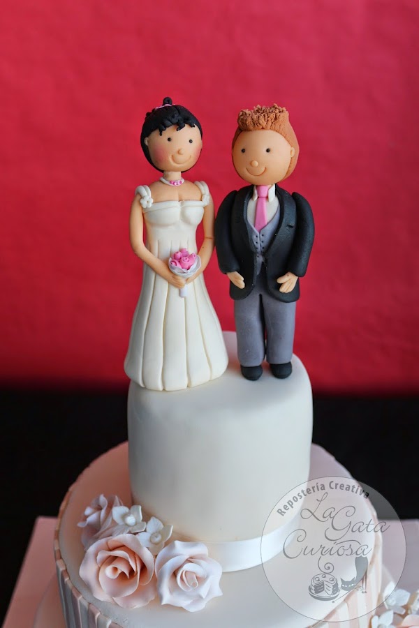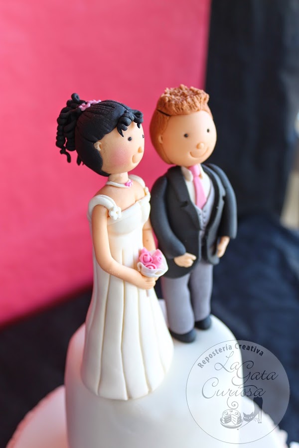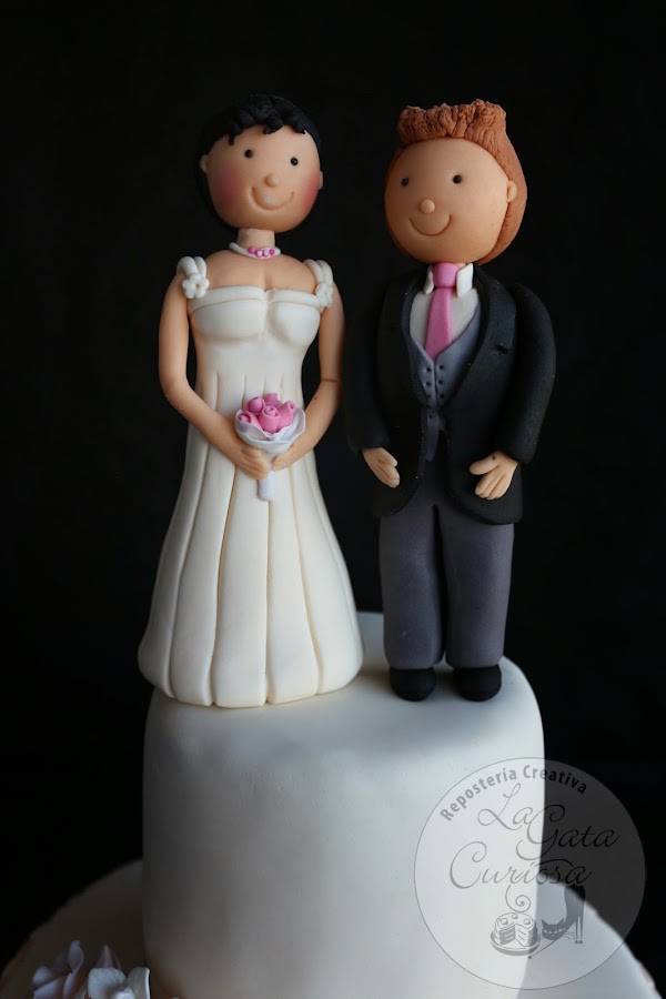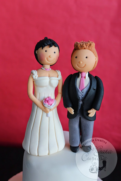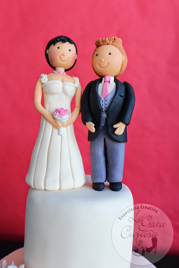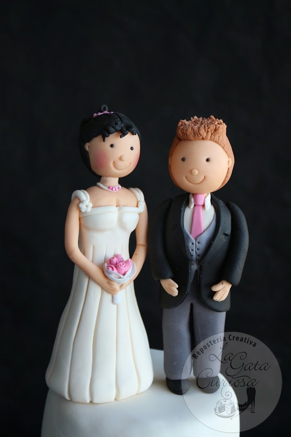 El broche final lo ponen las figuras de los novios también realizas en fondant.