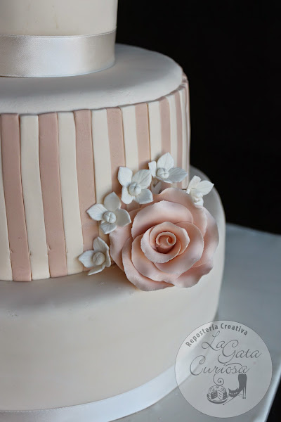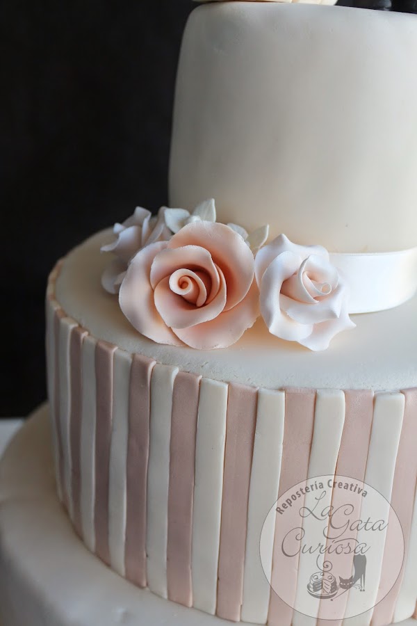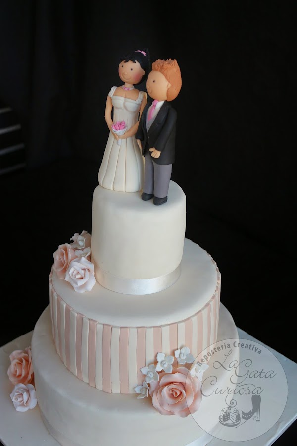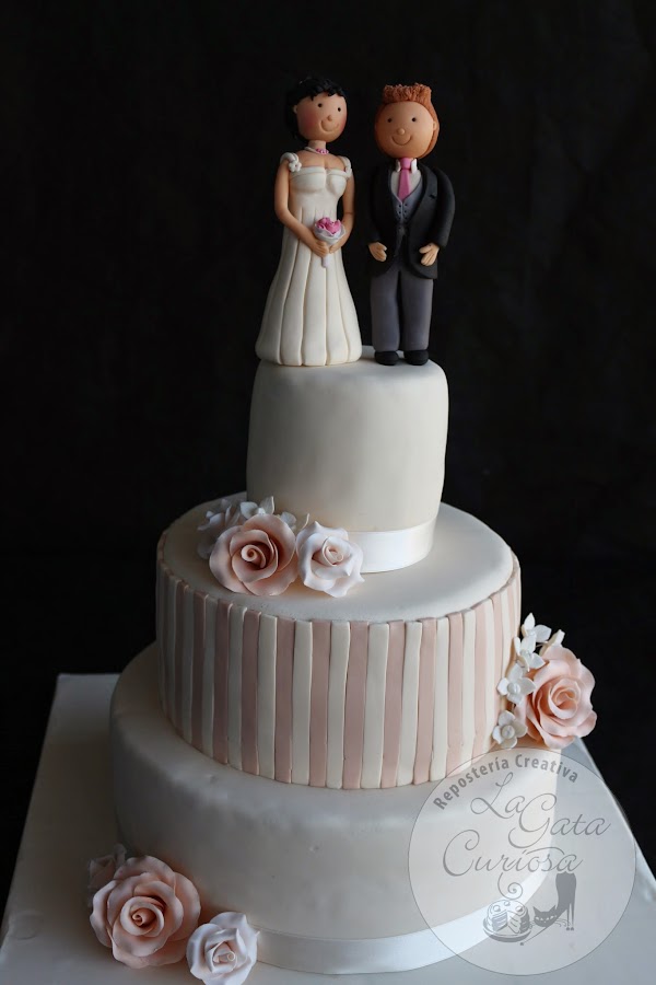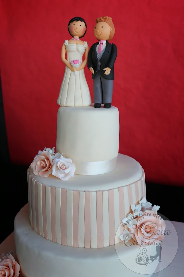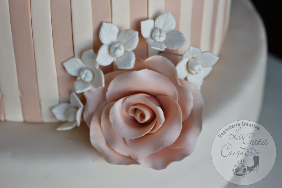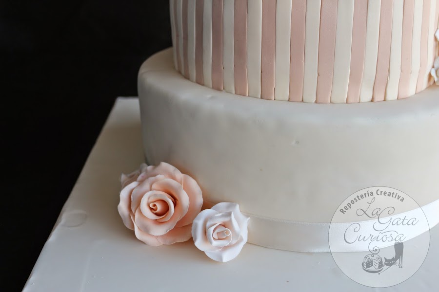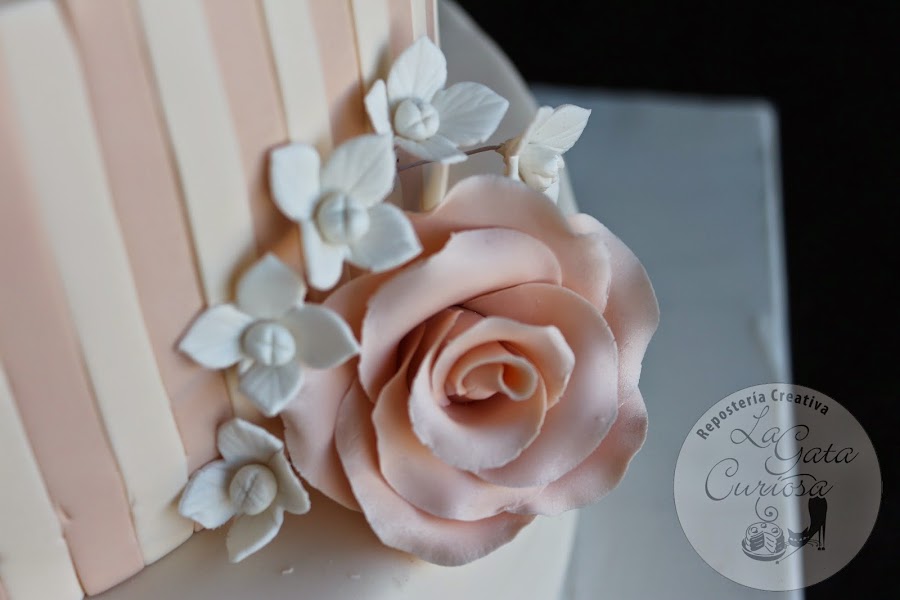 Casi todas las tartas que hacemos son para niños, con mucho colorido y muñequitos simpáticos, así que cuando nos llega la oportunidad de hacer una tarta de bodas nos hace mucha ilusión, es un cambio total de chip, pasamos del colorido a los tonos pastel, de los muñecos a las flores, de llevar mucha decoración a una decoración minimalista.