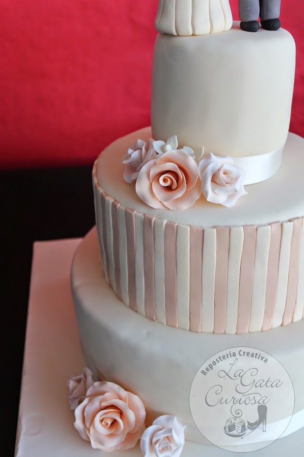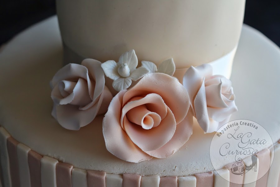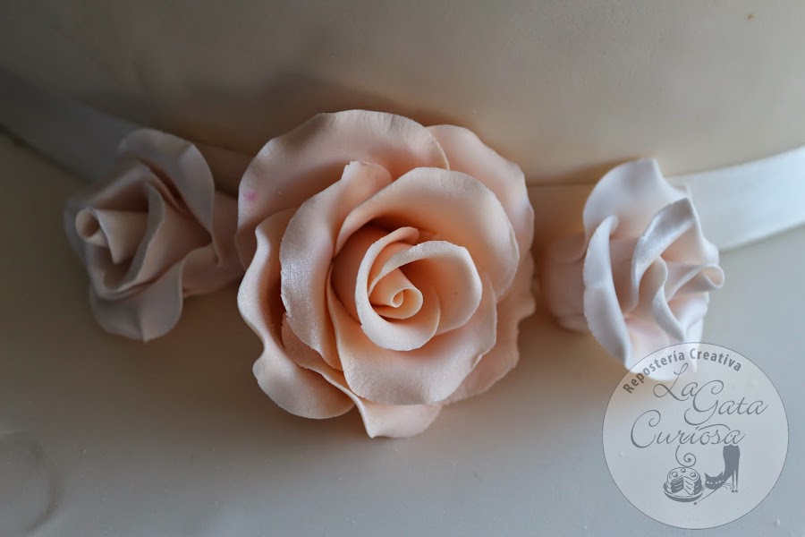 La tarta aunque no se aprecie en las fotos es grande, pesaba antes de poner el fondant más de 7 kilos, en color beig muy clarito combinado con un tono salmón, lleva rosas en tono salmón y en tono beig más claro y unas pequeñas flores en blanco.