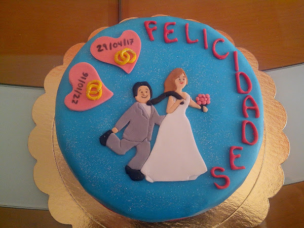 Aqui os traigo otra de las tartas que he hecho ultimamente. Esta me la encargo una chica que iba a cenar con unas amigas y dos de ellas se van a casar en un futuro( ya tienen fecha de boda), y para sorprenderlas les regalaron esta tarta. Fue una tarta express porque me la encargaron de un dia para otro , pero como era sencilla se pudo hacer.