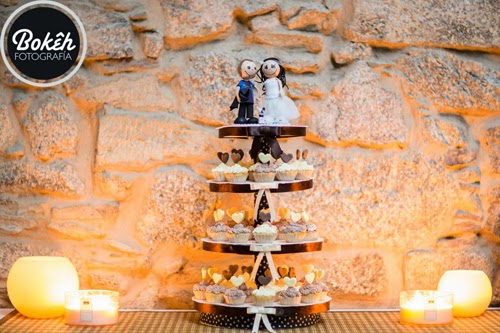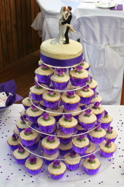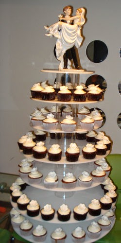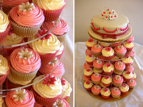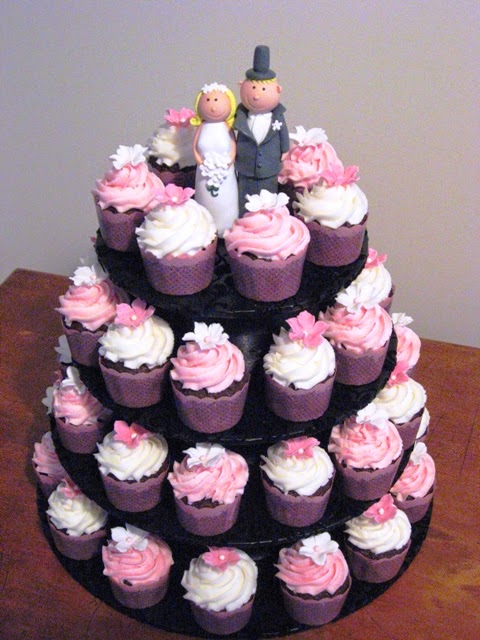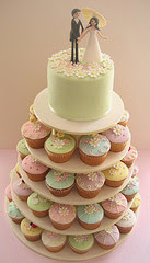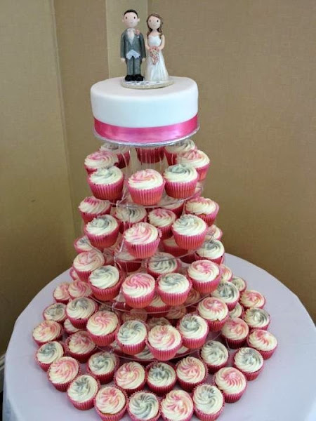 Se trata de una estructura de varios pisos en forma de tarta, pero con la diferencia que en cada piso encontramos varios cupcakes, que pueden ser iguales o diferentes y muchas veces decorados con la temática de la boda, y en la parte superior se suelen acompañar de mini tartas fondant o directamente van las figuras de los novios.