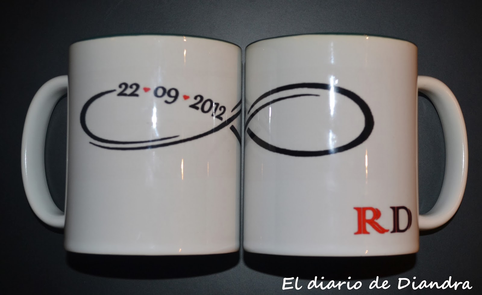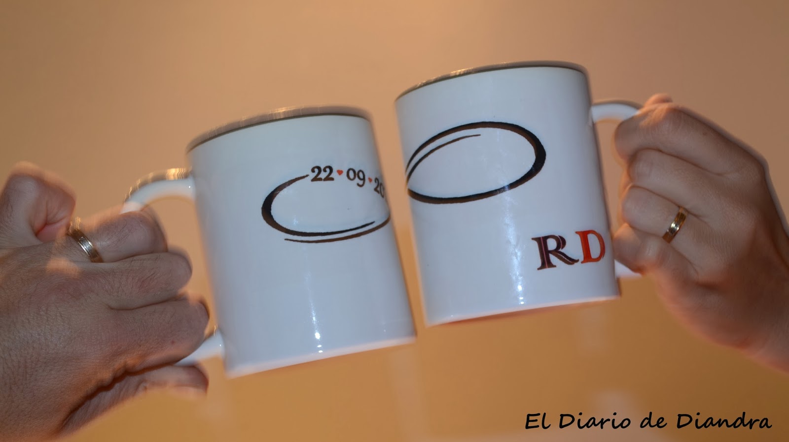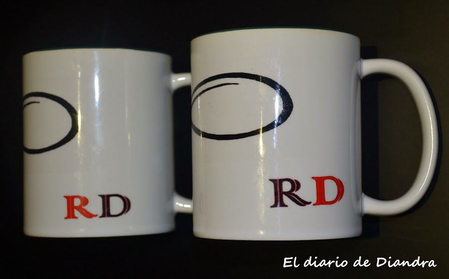 Para diferenciar cuál sería su taza de la mía añadimos al lado del asa nuestras iniciales (R+D) y pintamos en rojo la R en una taza y la D en la otra.