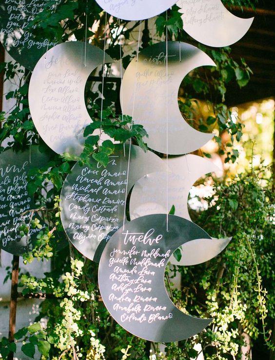 Y en lo relacionado con la decoración, que es lo que nos atañe en realidad, pues imaginaos…¿qué no podéis hacer? Lo que os decía antes: decoración suspendida en forma de lunas y estrellas, una iluminación espectacular que de la bienvenida a vuestros invitados como si estuviera entrado en una jardín estrellado o en la carpa donde vayáis a hacer la recepción simulando lo mismo, cenar bajo un manto de estrellas. El backdrop de ceremonia también puede estar relacionado con esto incluyendo alguna estrella colgada de un arco junto con decoración floral, los meseros, el seating plan y hasta un photocall donde la luna sea la más perfecta invitada de la boda.