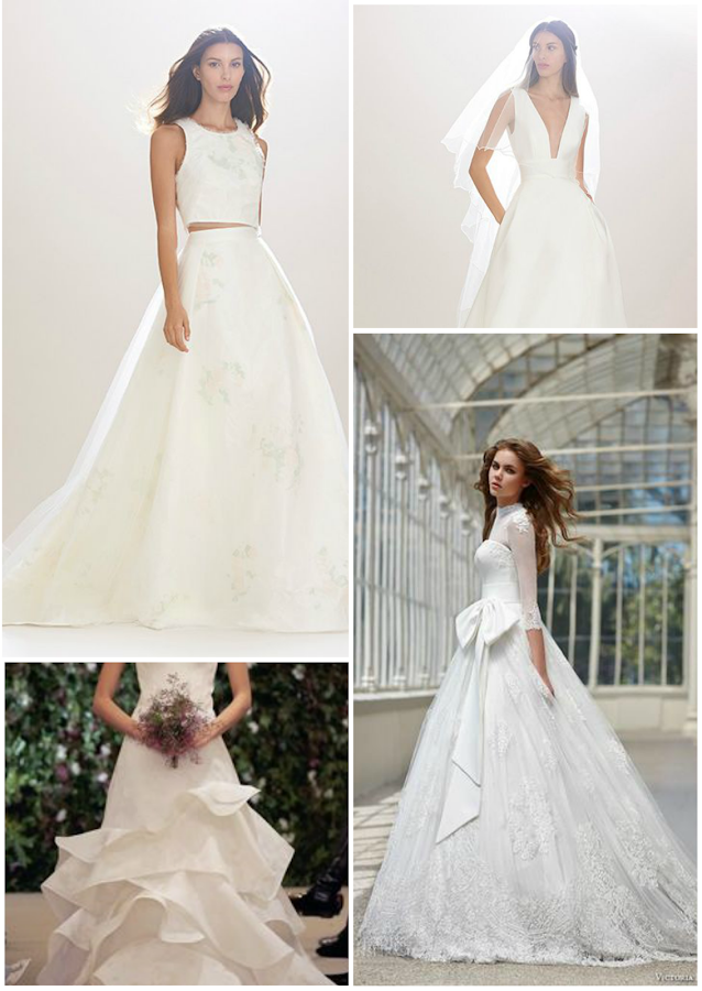 La tendencia para vestidos de novia se resume en el uso de la línea A en las faldas, los apliques de flores en 3D, el tul vuelve a estar IN, los escotes pronunciados, los vuelos y lazos también serán muy vistos en estos eventos. El cuello V, para las mas atrevidas vestidos cortos que favorezcan la figura femenina con un estilo de caida suave.