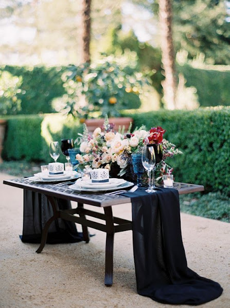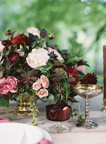 Esta es la tendencia que más me gusta, digamos que me enamora…. y además va unida a la anterior. Me encantan las decoraciones “oscuras”, en lo que a las flores se refiere, tonos granate, mezclados con rosa clarito, azul, melocotón, en definitiva tonos pertenecientes a las estaciones de otoño-invierno, unidos a elementos barrocos o góticos, como por ejemplo cuberterías y vajillas doradas.