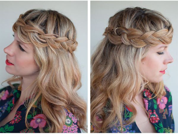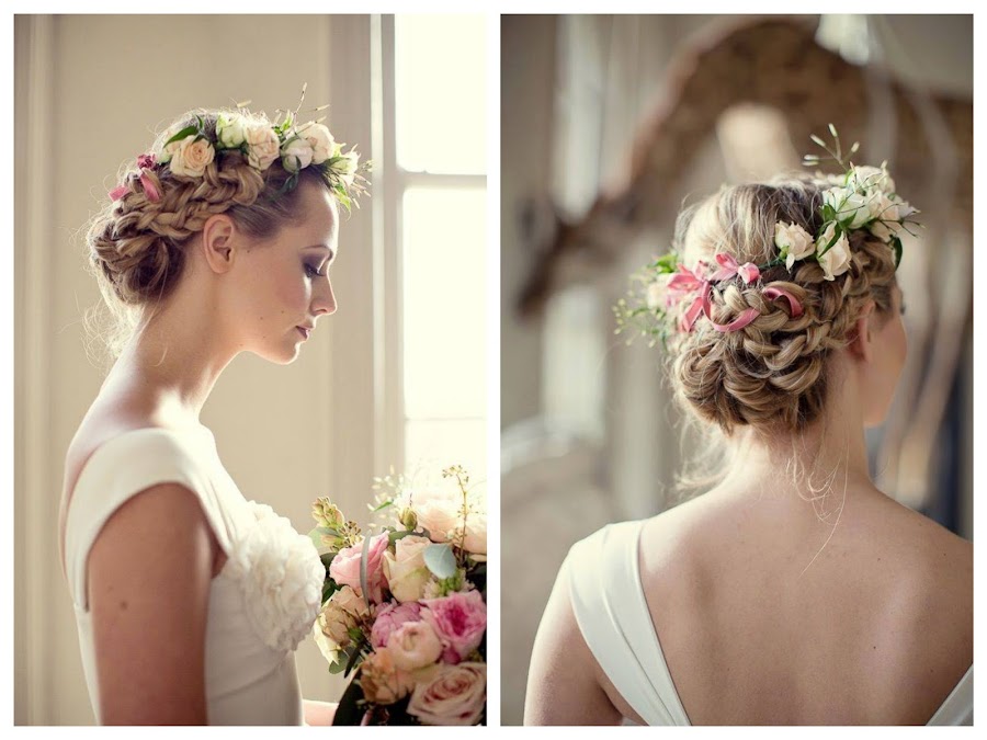 Trenzas a un lado: despeinadascon corona de flores o diadema.