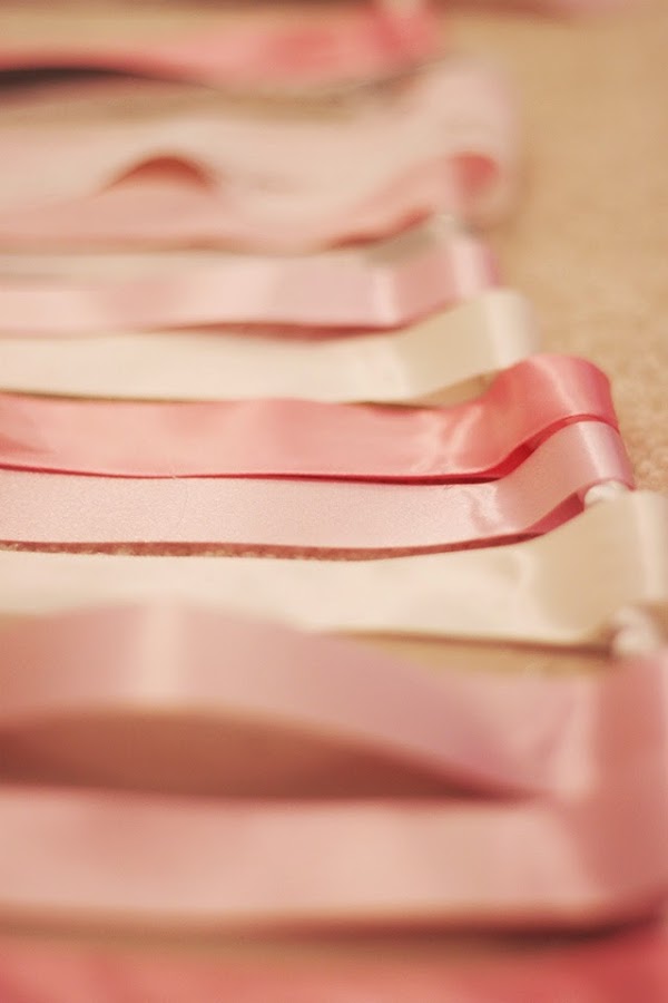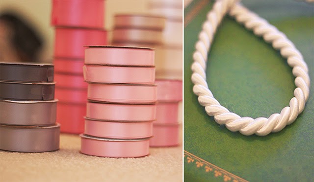 Cortaremos las cintas y el encaje a la medida deseada y las iremos colocando sobre el cordón de la manera que queramos que queden dispuestas (para saber cuantas nos harán falta mas o menos).