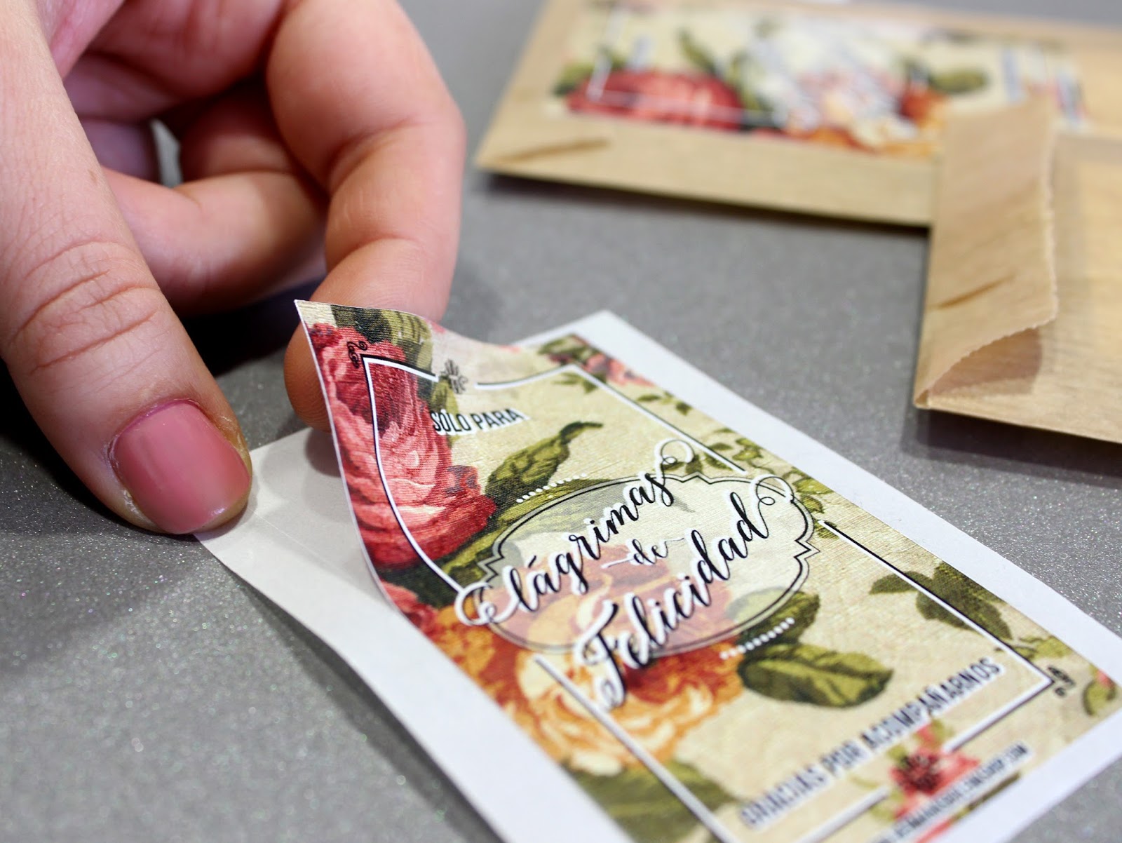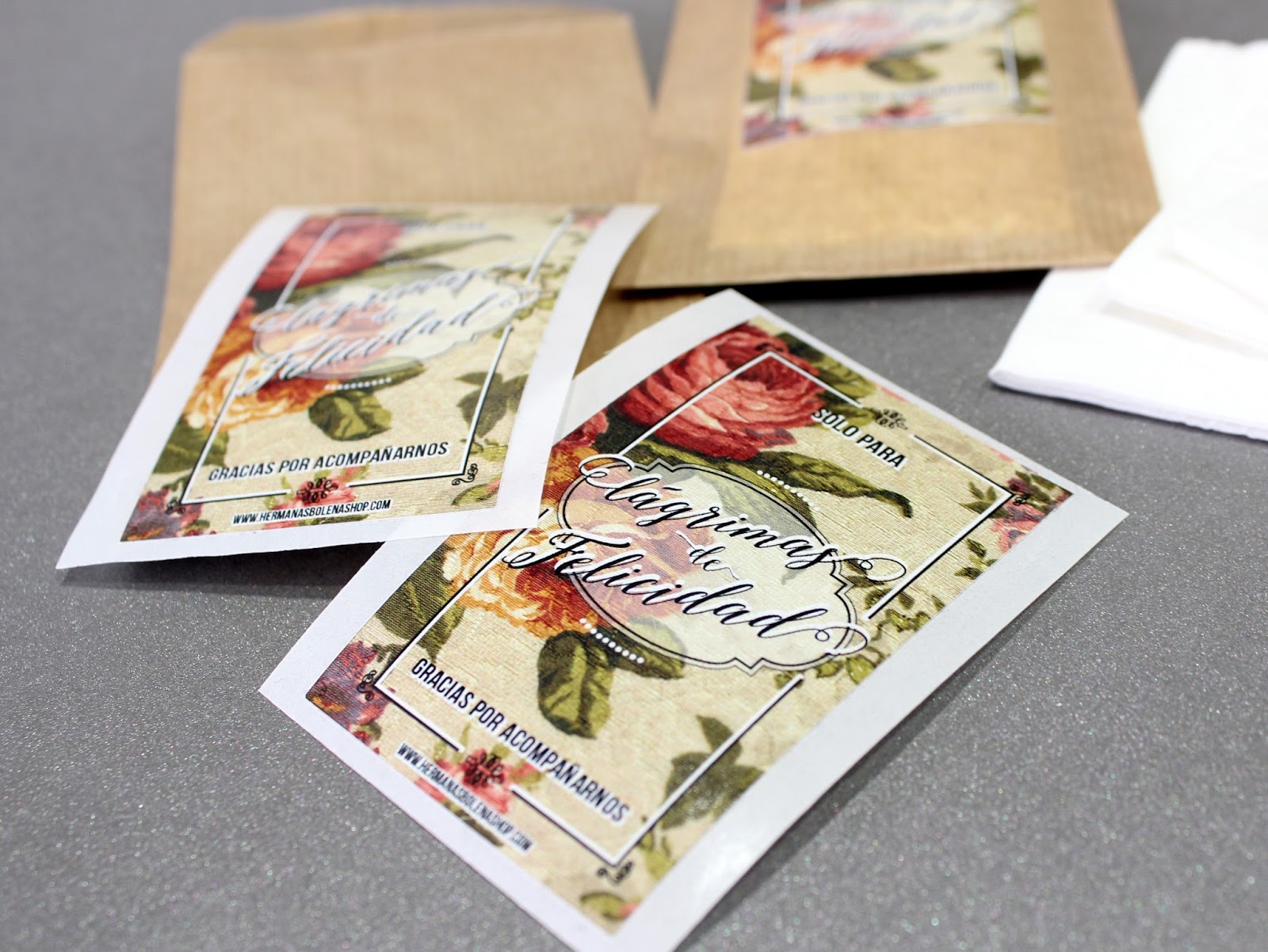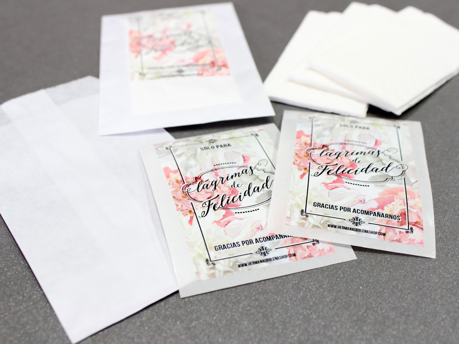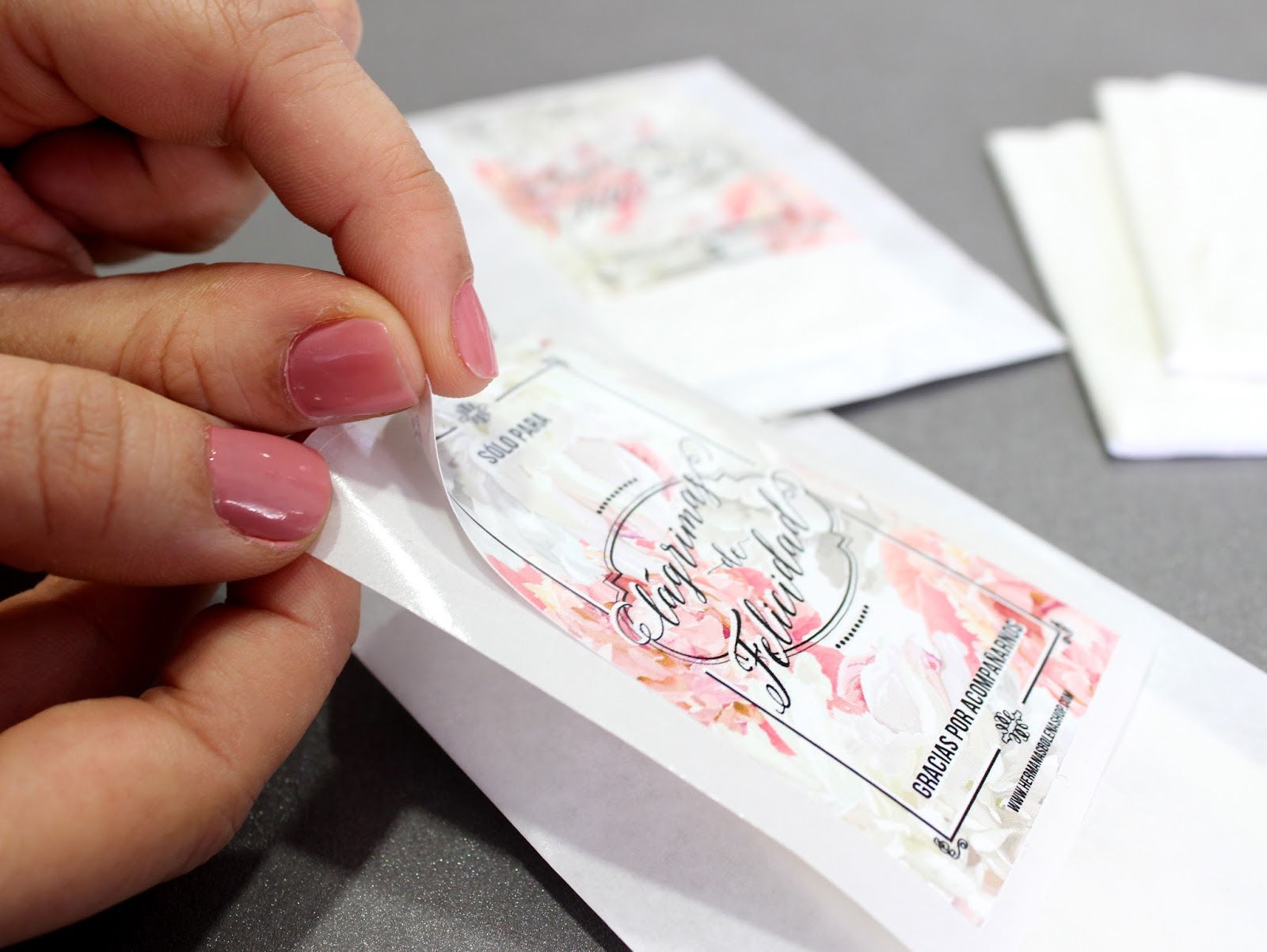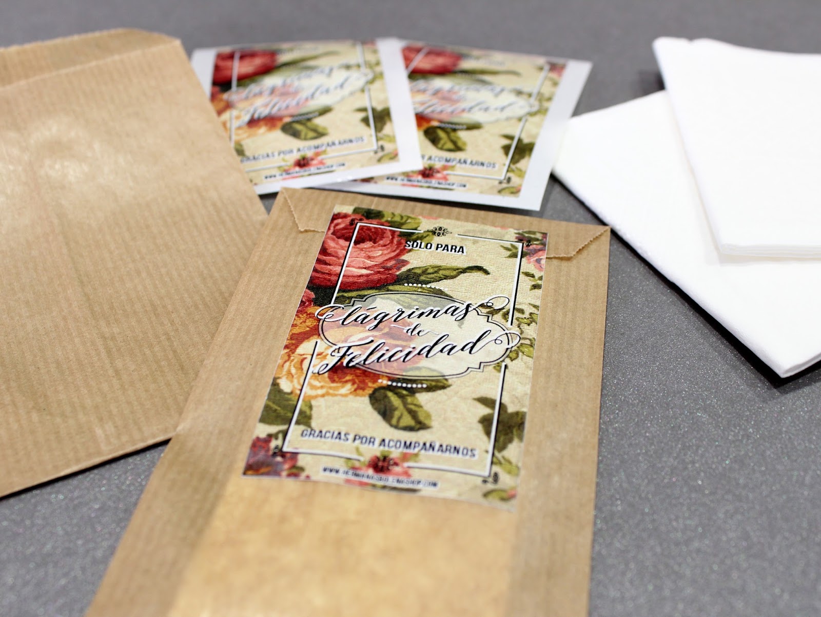 Cada uno de estos kits se componen de 20 bolsas de celulosa (blancas o craft) y de 20 pegatinas rectangulares (peonías o rosas silvestres). Por supuesto, vienen por separado para que primero podáis introducir los pañuelos en cada bolsita y a continuación, cerrarlos con las pegatinas.
