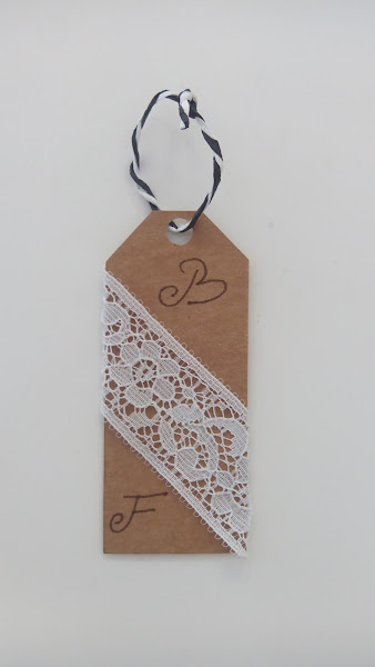 En esta opción he elegido un poco de encaje y las iniciales de los novios y con el cordel lo puedes atar al regalo. Algo sencillo y fácil de realizar.