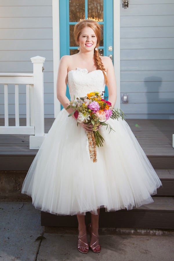 El look de la novia me parece juvenil y diferente, si eres de la que no quiere lucir un vestido largo, quizás el corto midi sea el tuyo (importante el volumen a base de capas de tul). Elige unos zapatos bonitos ya que en éste caso si que los lucirás y un peinado sencillo.