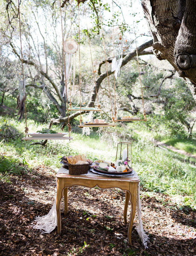 La mesa de aperitivos, acompañada con columpios, decora este rincón tan bonito.