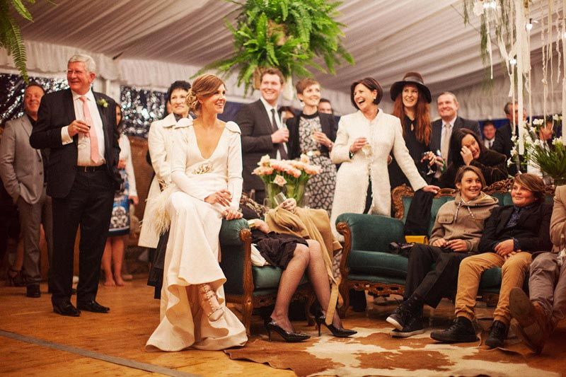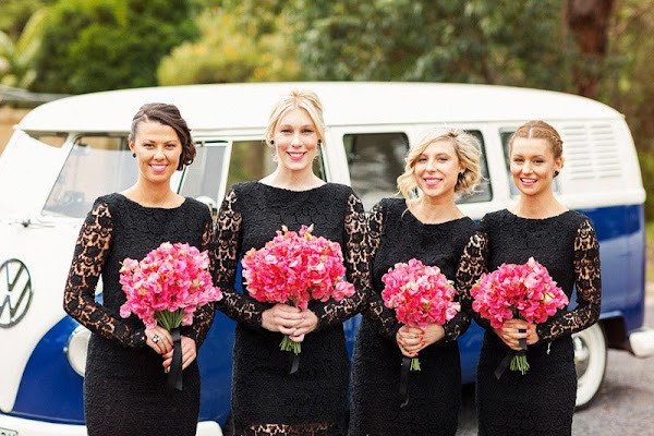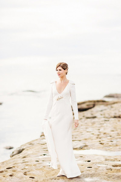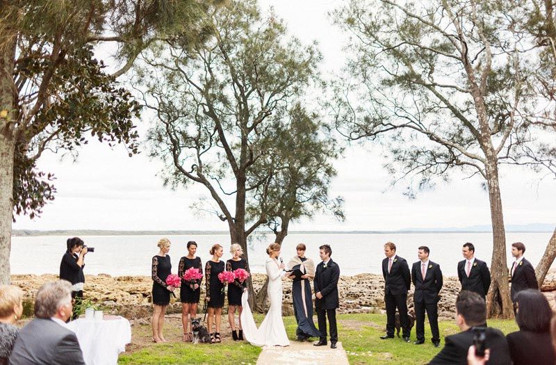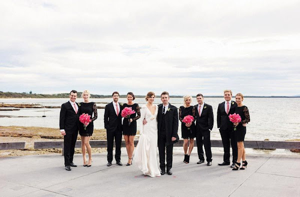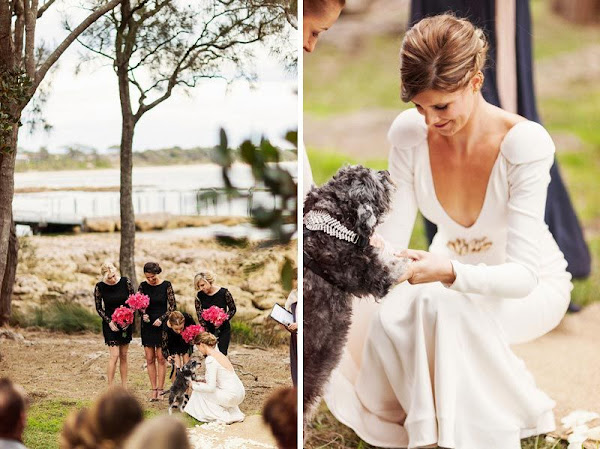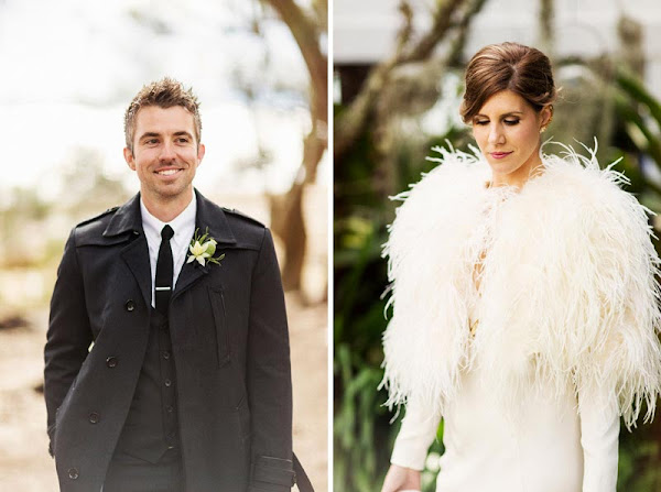 Celebrada en la costa sureste de Australia, la novia, iba increíble con un vestidazo de manga larga con hombreras, con un atrevido y pronunciado escote en V y unos complementos ideales: una capa de plumas de avestruz y unas sandalias con tachuelas de Valentino. Peinada con un moño bajo despeinado, que le quedaba monísimo! El novio iba la mar de original; con un traje de corte gabardina con chaleco debajo que, sinceramente, me ha encantado. Una pareja de 10, parecen barbie y Ken.