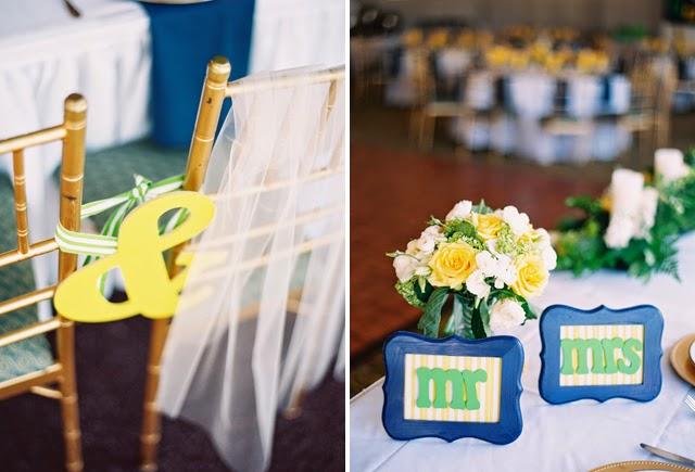 Cupcakes y cintas decoraban la mesa dulce. Unos marcos con "mr" y "mrs" en la mesa nupcial y la unión de las sillas con una "&" en amarillo.