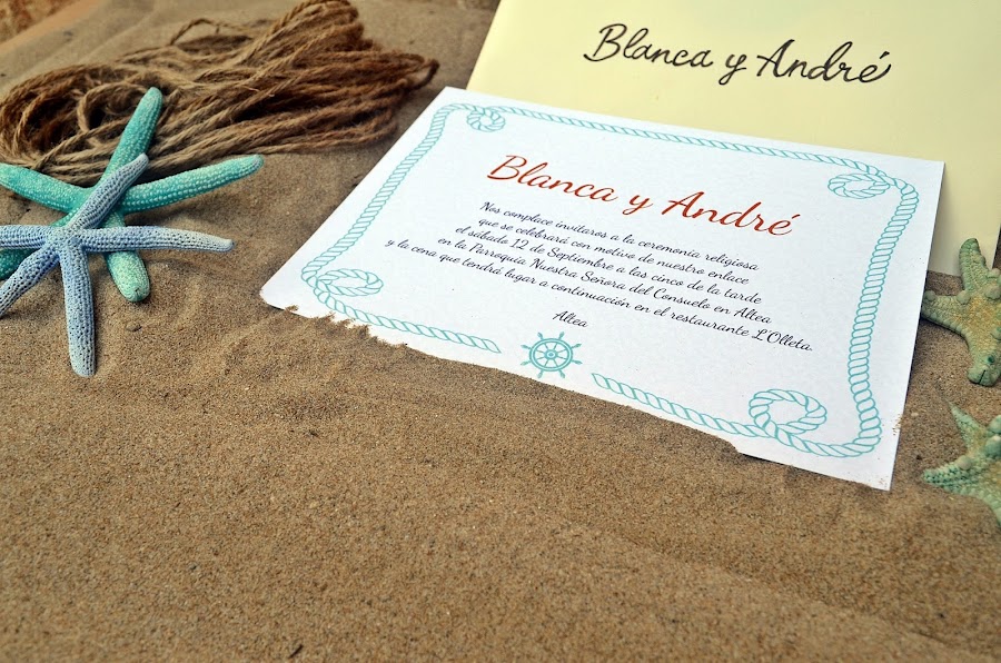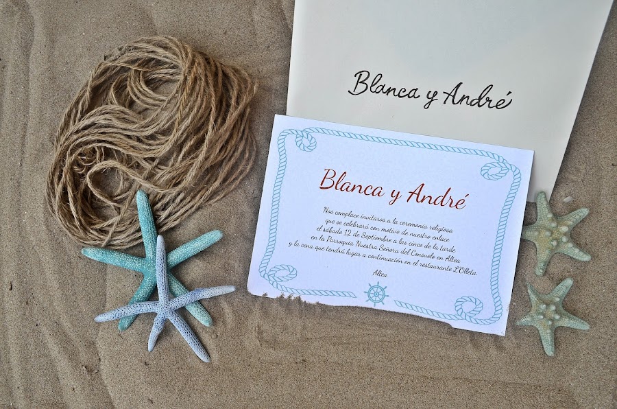 El sábado nos pondremos bien guapos y celebraremos su amor por todo lo alto al lado del mar; y como toda boda empieza con una invitación, para Blanca y André ideamos unas invitaciones sencillas, con el color de la arena y el azul cristalino del mar Mediterráneo. Una vez más confié en Charo de Fiesta Detalles e Invitaciones quién captó a la perfección la idea que teníamos en mente.