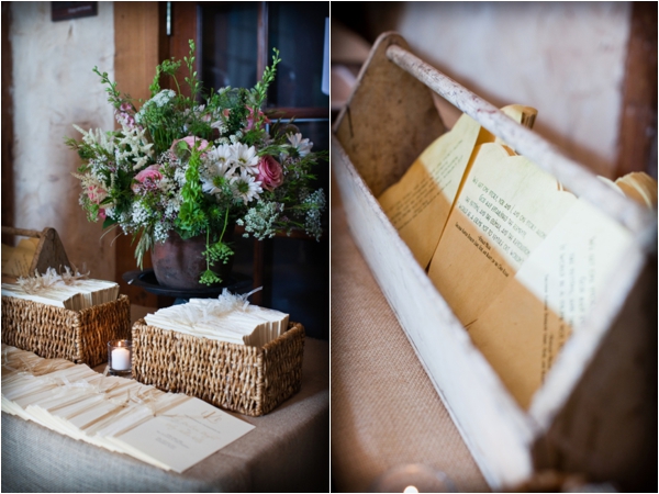 La ceremonia se celebro en un edificio en ruinas adornado con cortinas y sillas blancas. La decoración era muy similar a los ramos de la novia y las damas de honor. El pasillo estaba decorado con macetas de latón con flores silvestres al igual que el altar donde se realizo la ceremonia,una cruz hecha con flores.
