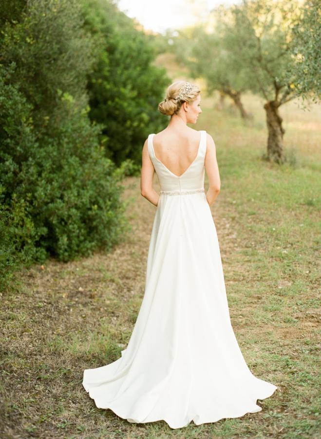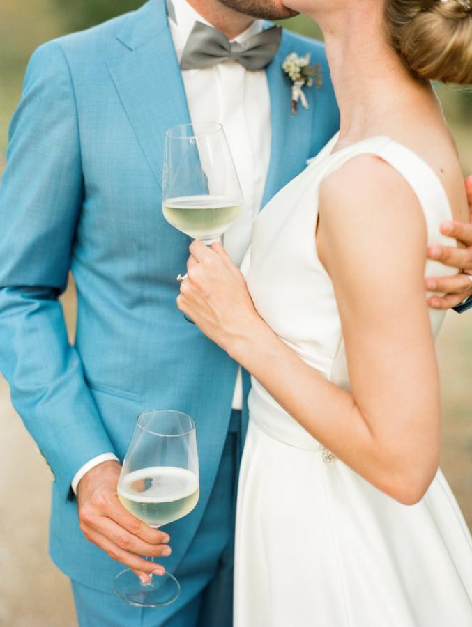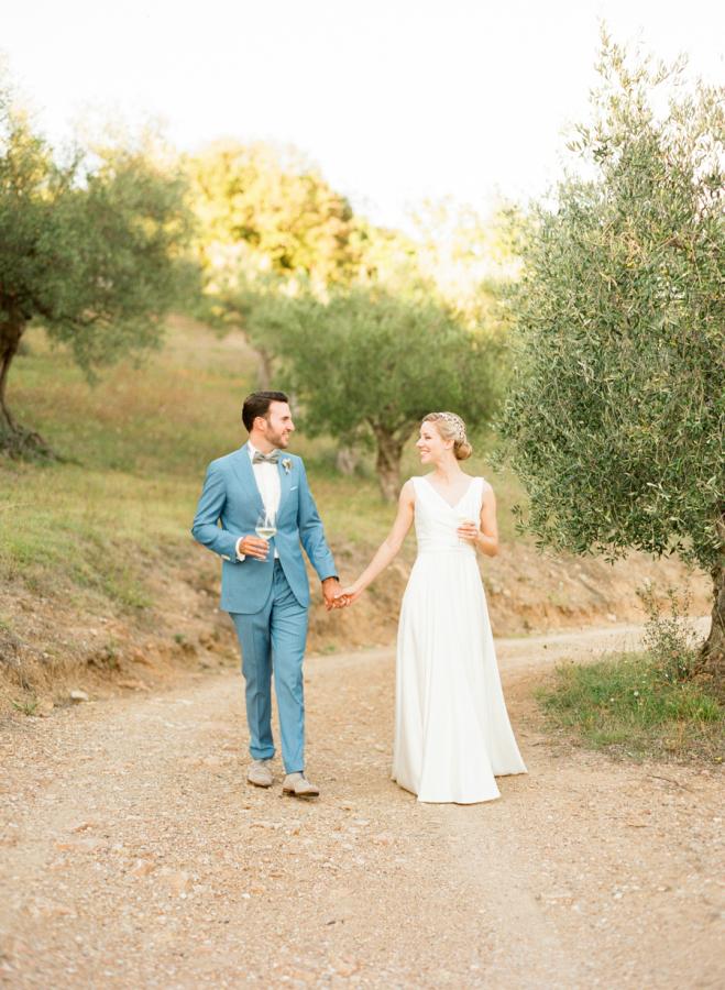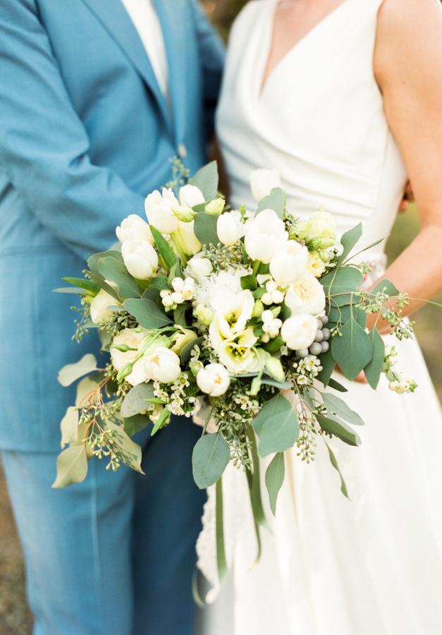 El estilo de los novios también está muy acorde con el de toda la boda, simple y relajado. Vestido vaporoso de la novia, ramo greenery, y azul turquesa para el novio