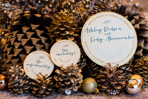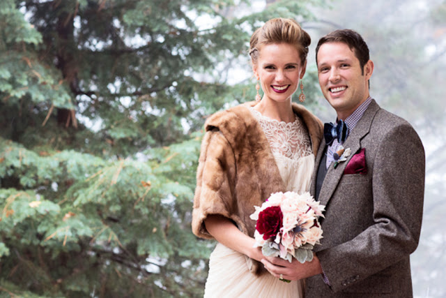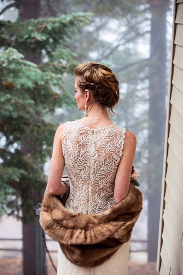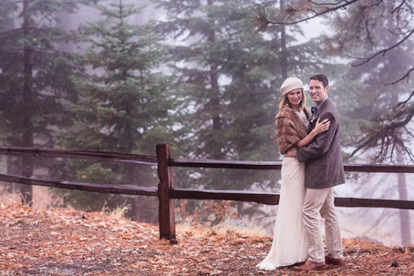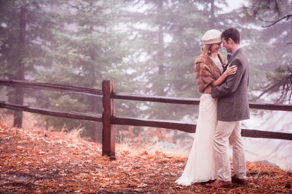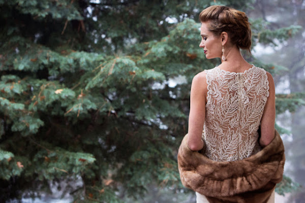 Seguimos perdidos en el bosque con otra boda invernal, con una novia que usa unos complementos preciosos, como son un bolero de pelo de color marrón y una boina de lana en tono beige.