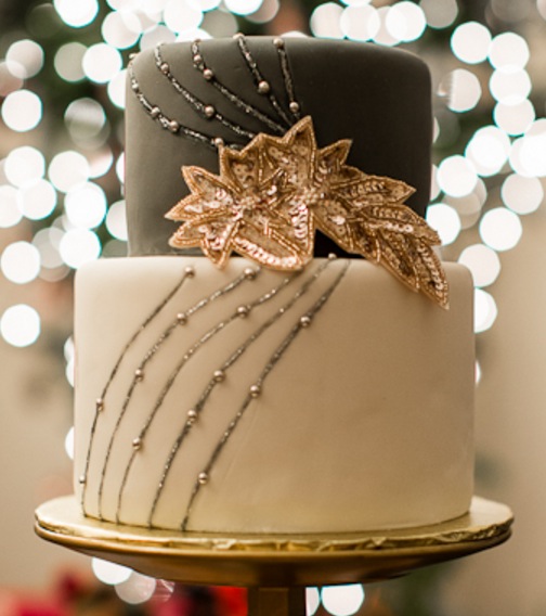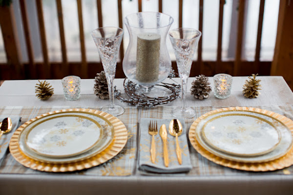 Para las bodas de invierno con toque navideño queda genial la decoración con piñas doradas y bolitas, bien para decorar la candybar u otro rincón.