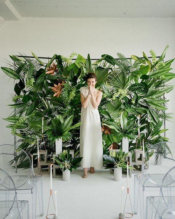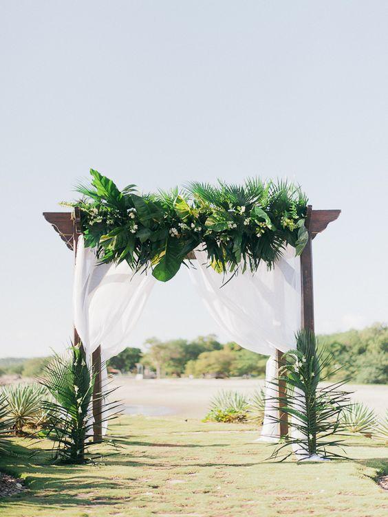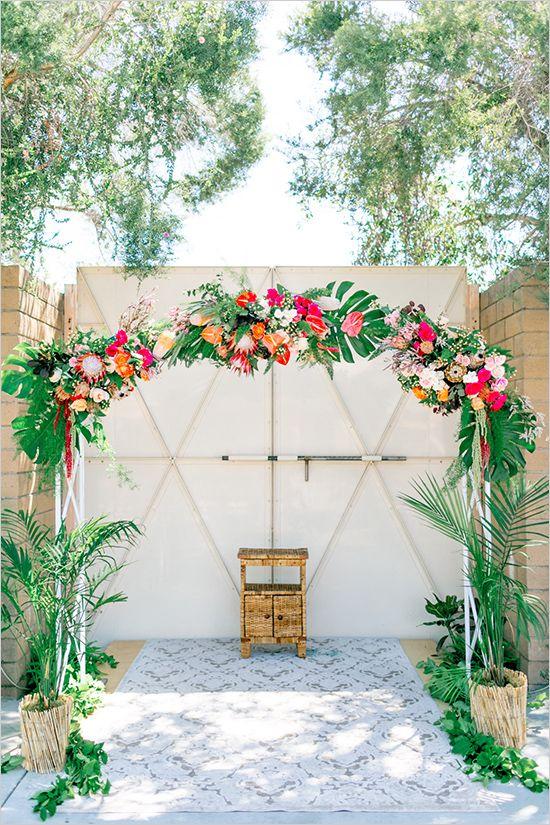 Una boda tropical va a requerir de muebles de ese estilo como las sillas de mimbre de respaldo alto, mesitas, pufs de colores, sofás de caña o cuerda, mesas de banquete llenas de verdor y flores vistosas, bebidas refrescantes y con mucho color, frutas tropicales y, por supuesto, un precioso altar que nos transporta a la Polinesia…